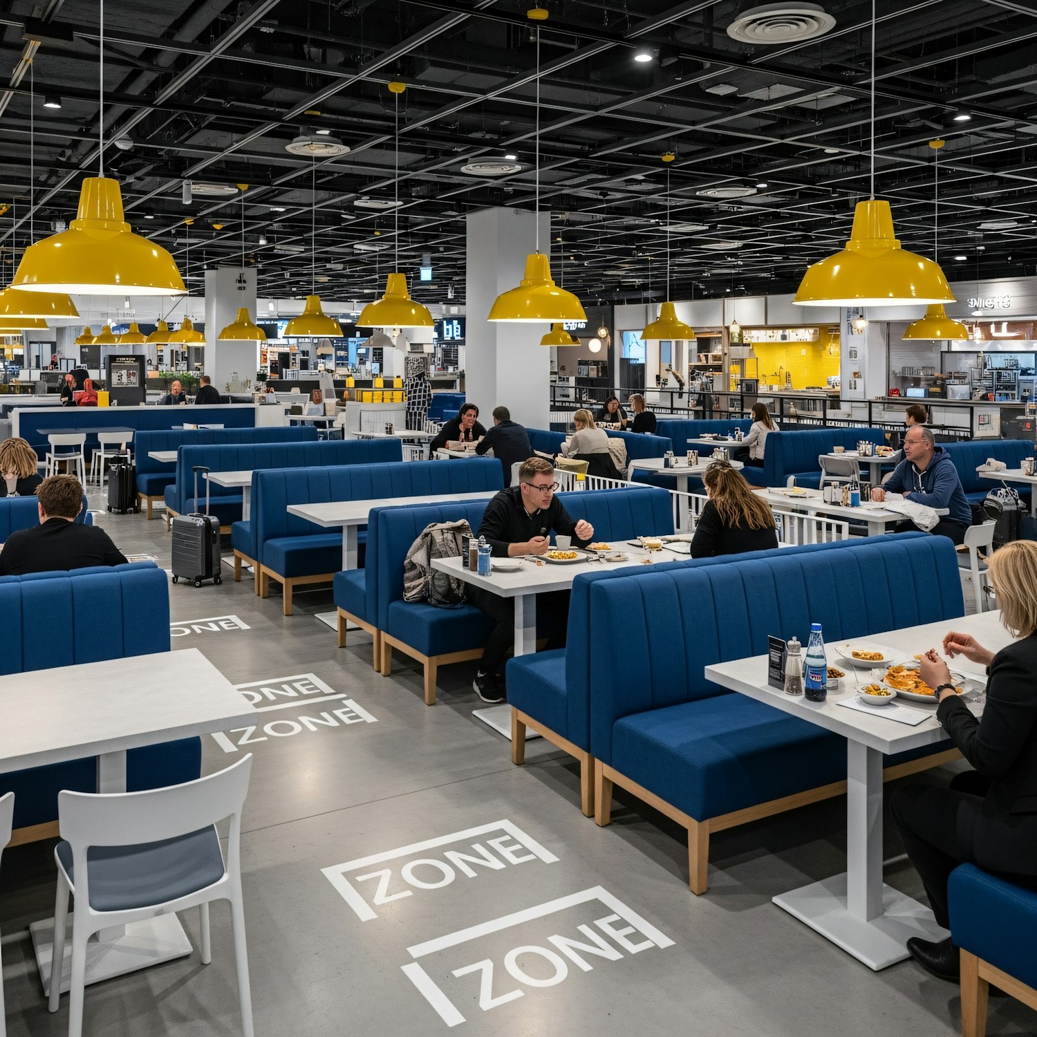 Modern cafeteria with blue booths, yellow pendant lights, and a lively atmosphere. People enjoy meals in a clean, organized space.