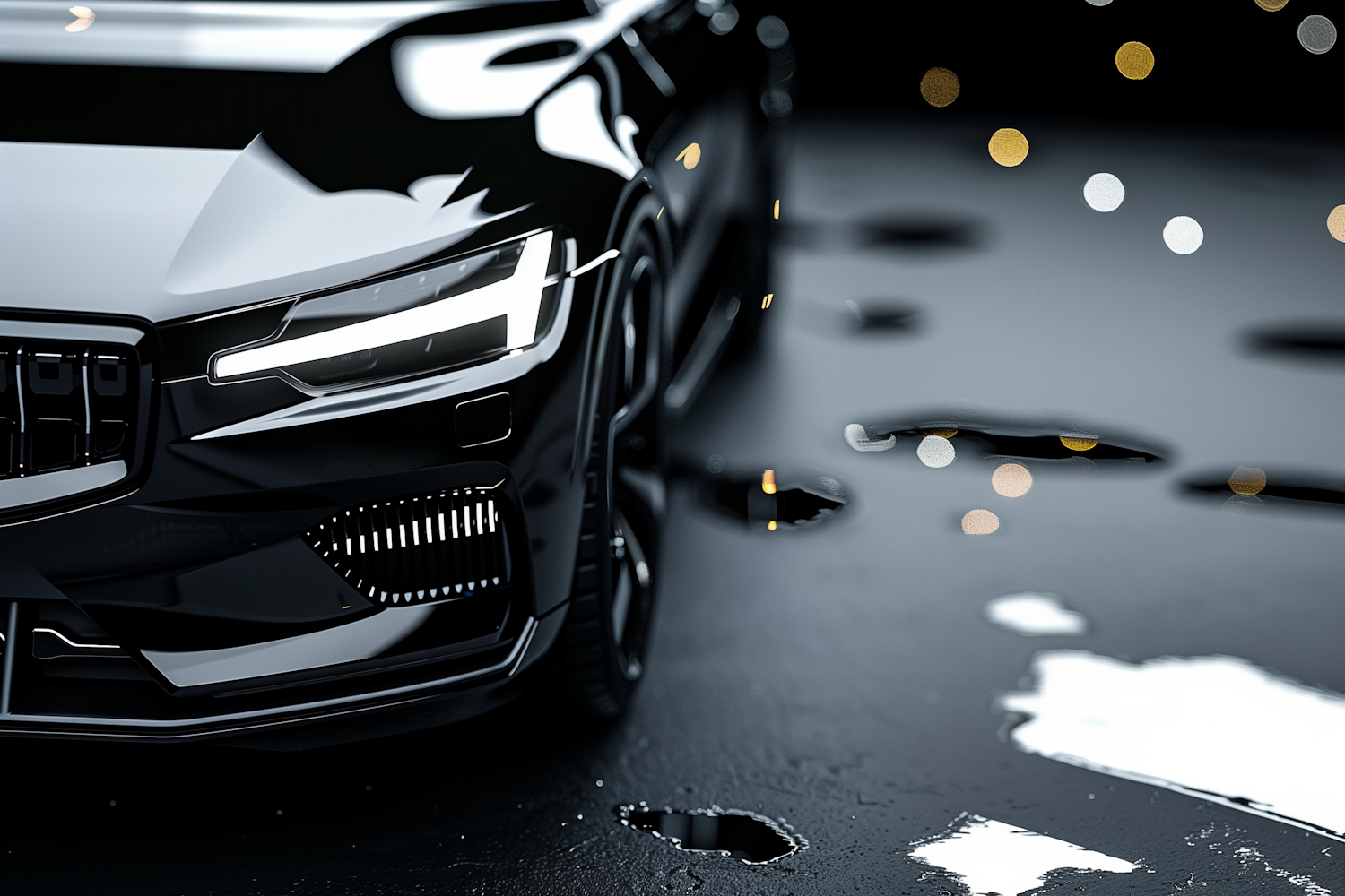 Close-up of a sleek black luxury car with glowing LED headlights, glossy finish, and bokeh lights reflecting on a wet surface.