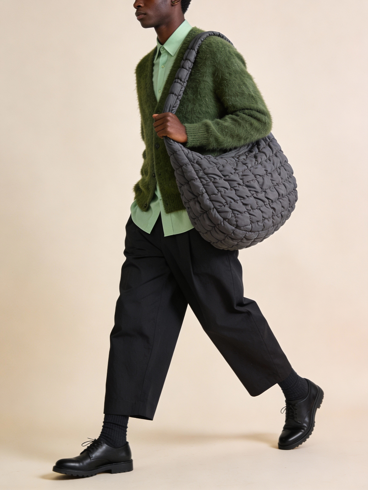 Stylish individual in a green cardigan and black trousers carrying a large gray bag, showcasing modern casual fashion.