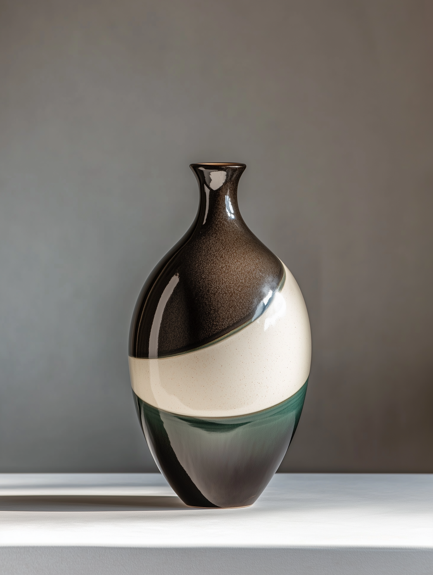 Modern ceramic vase with a glossy tri-color design in brown, cream, and green, perfect for minimalist decor. Stylish and elegant.