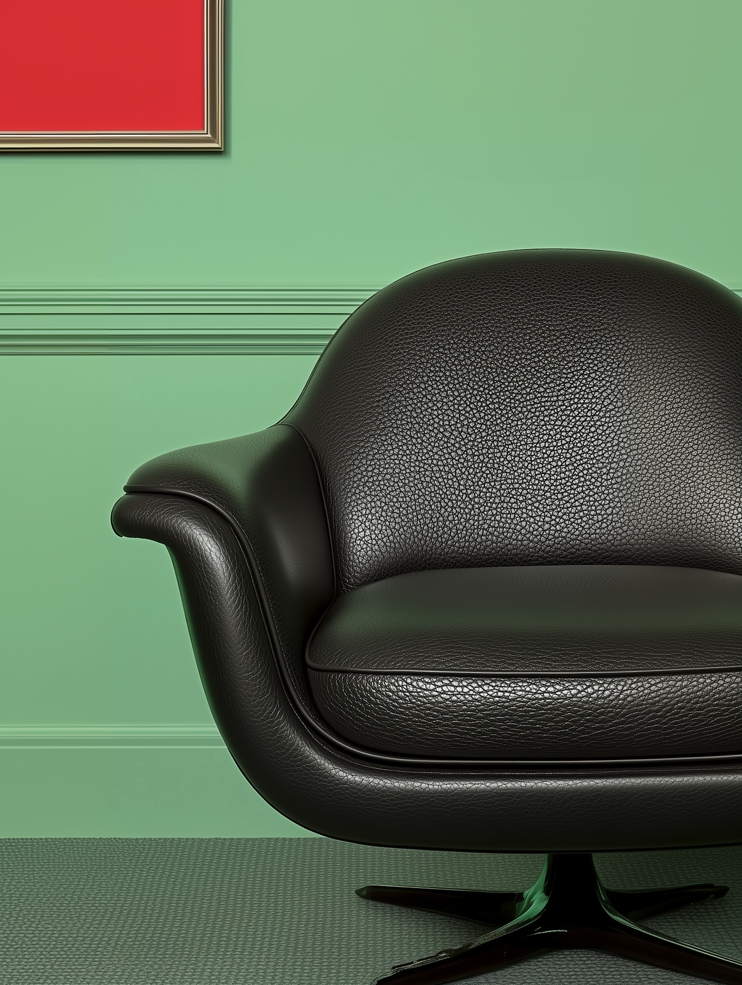 Modern black leather chair against a vibrant green wall with red artwork. Sleek design and bold color contrast create a striking visual.