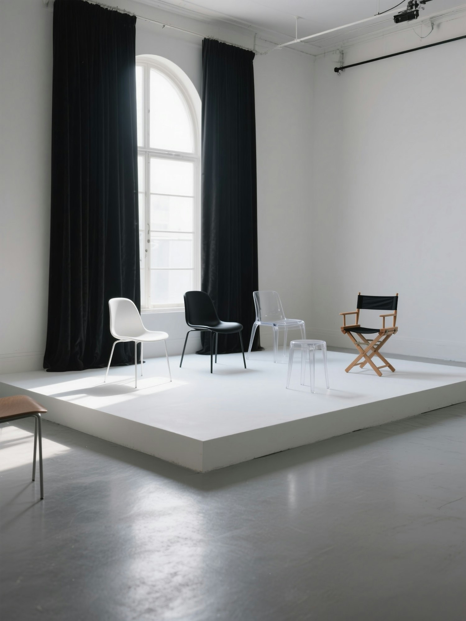 A minimal photography studio space, white platform with an assortment of modern chairs (black, white, transparent, stool, director’s chair), soft daylight streaming through a large arched window with black curtains, grey polished floor, editorial interior style