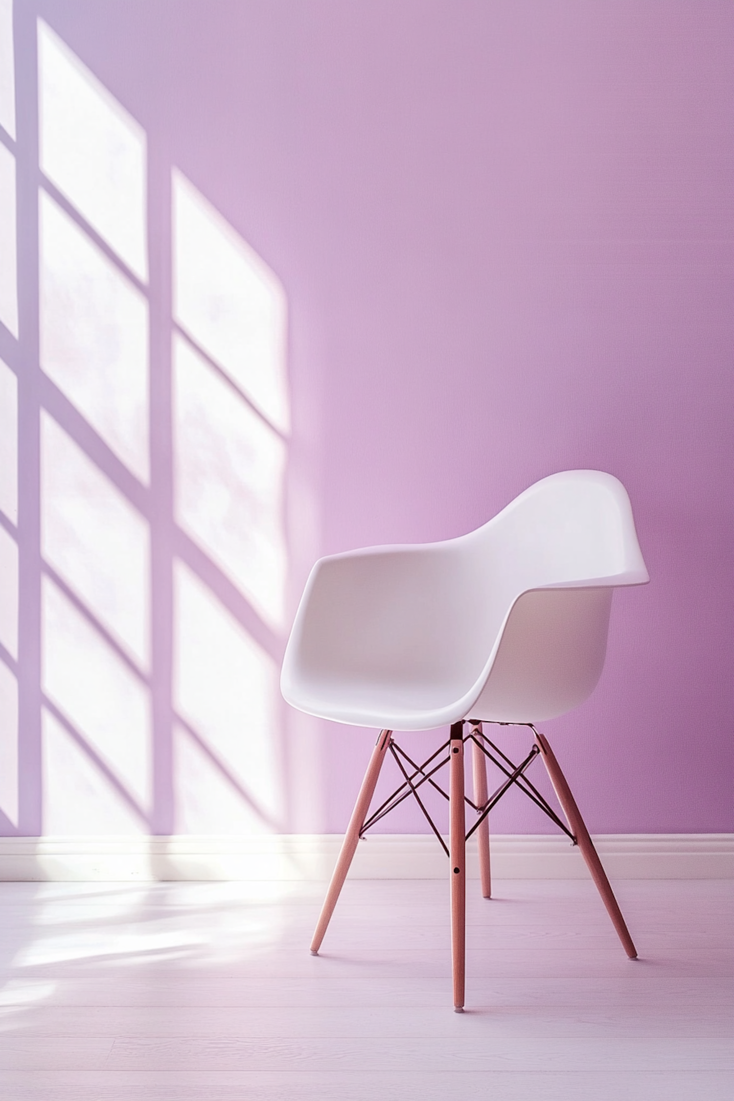 Modern white chair with wooden legs against a pastel lavender wall, bathed in soft natural light with geometric window shadows.