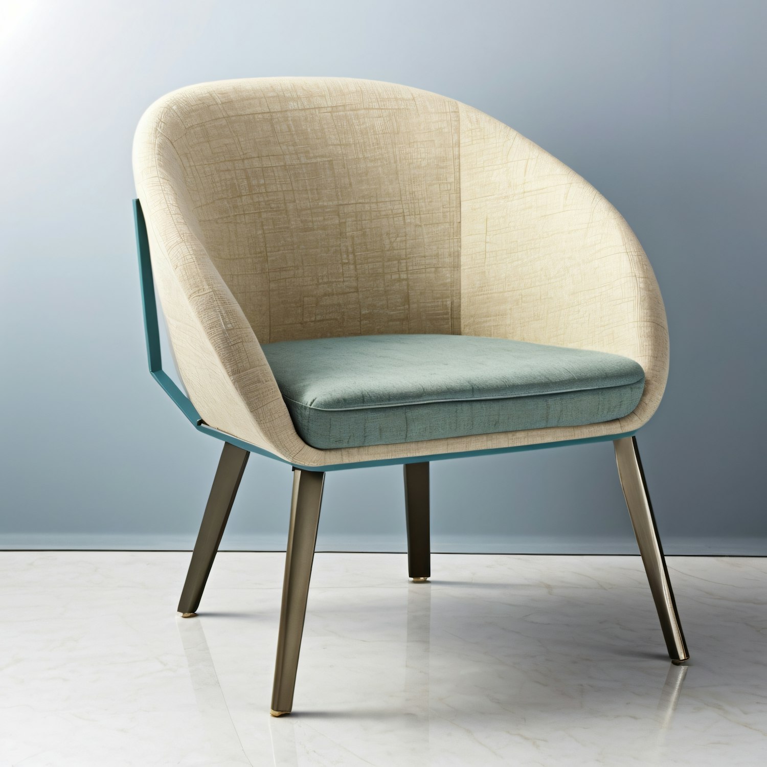 Modern chair with beige upholstery and teal cushion, set against a light blue background. Features sleek metallic legs and a marble floor.