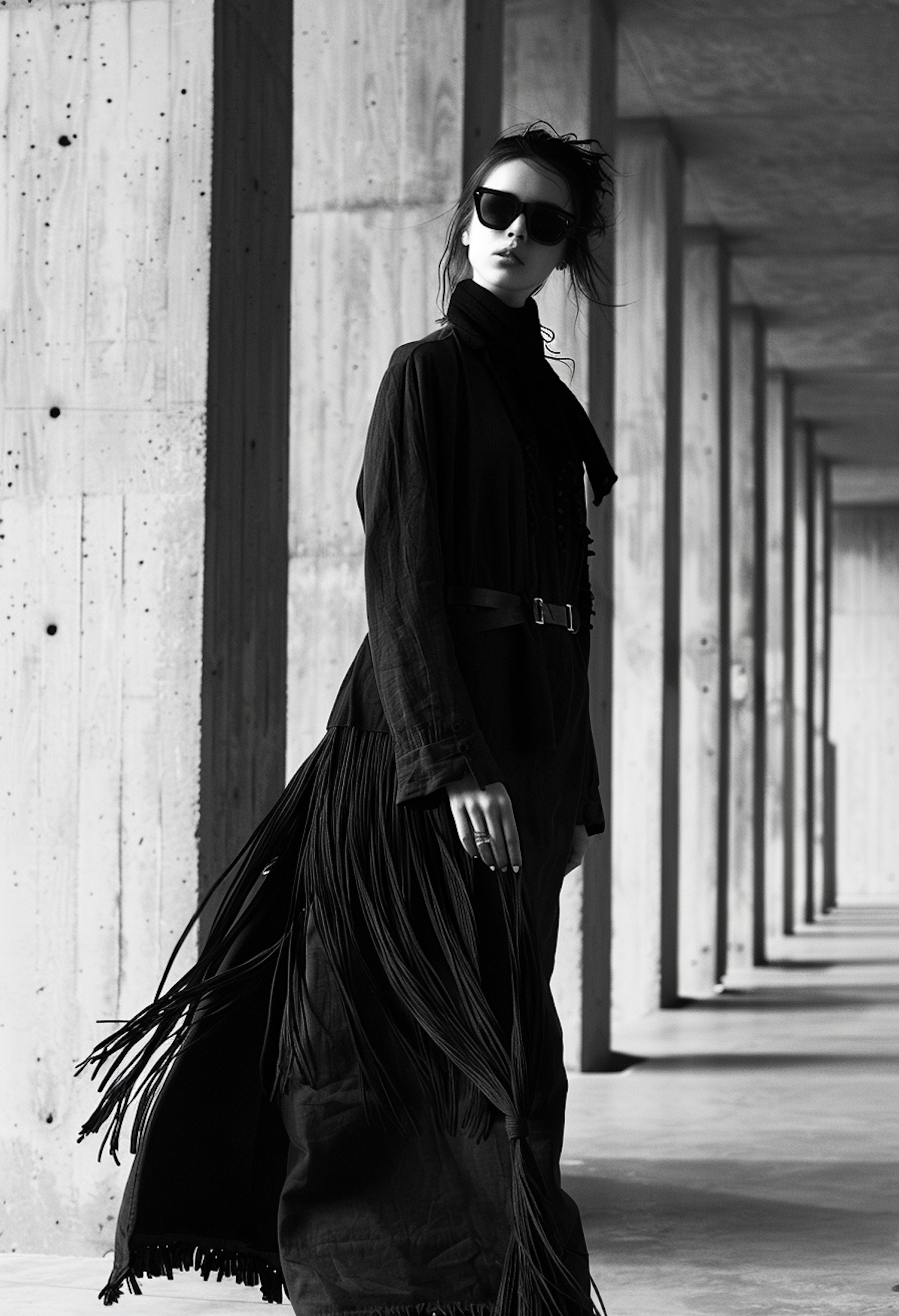 Chic woman in black coat with fringe details, wearing sunglasses, stands in a modern concrete setting. Monochrome, stylish, and edgy.
