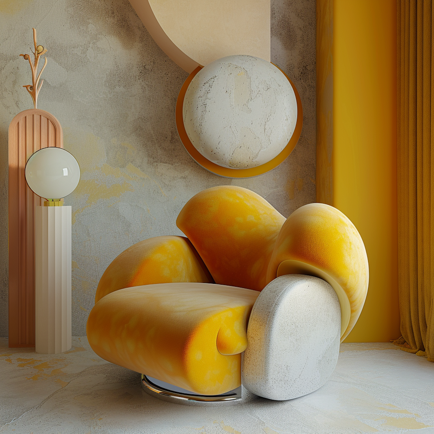 Stylish modern interior with a vibrant yellow armchair, abstract wall art, and a sleek lamp on a textured backdrop.