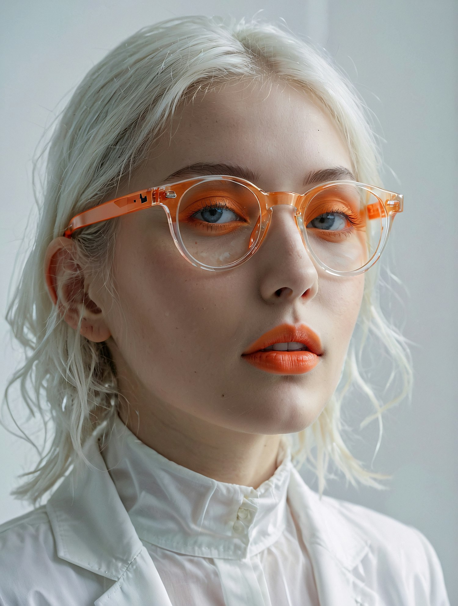 Stylish portrait of a woman with platinum blonde hair, orange glasses, and bold makeup, dressed in a white blazer and blouse.