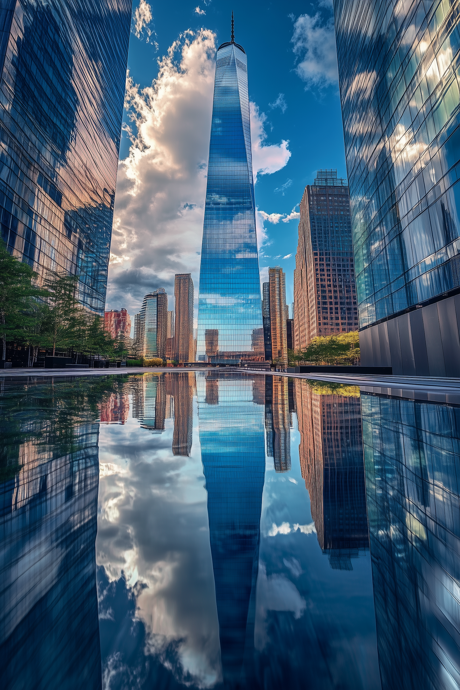 Stunning cityscape with a skyscraper reflecting in water, surrounded by modern buildings and a vibrant blue sky.