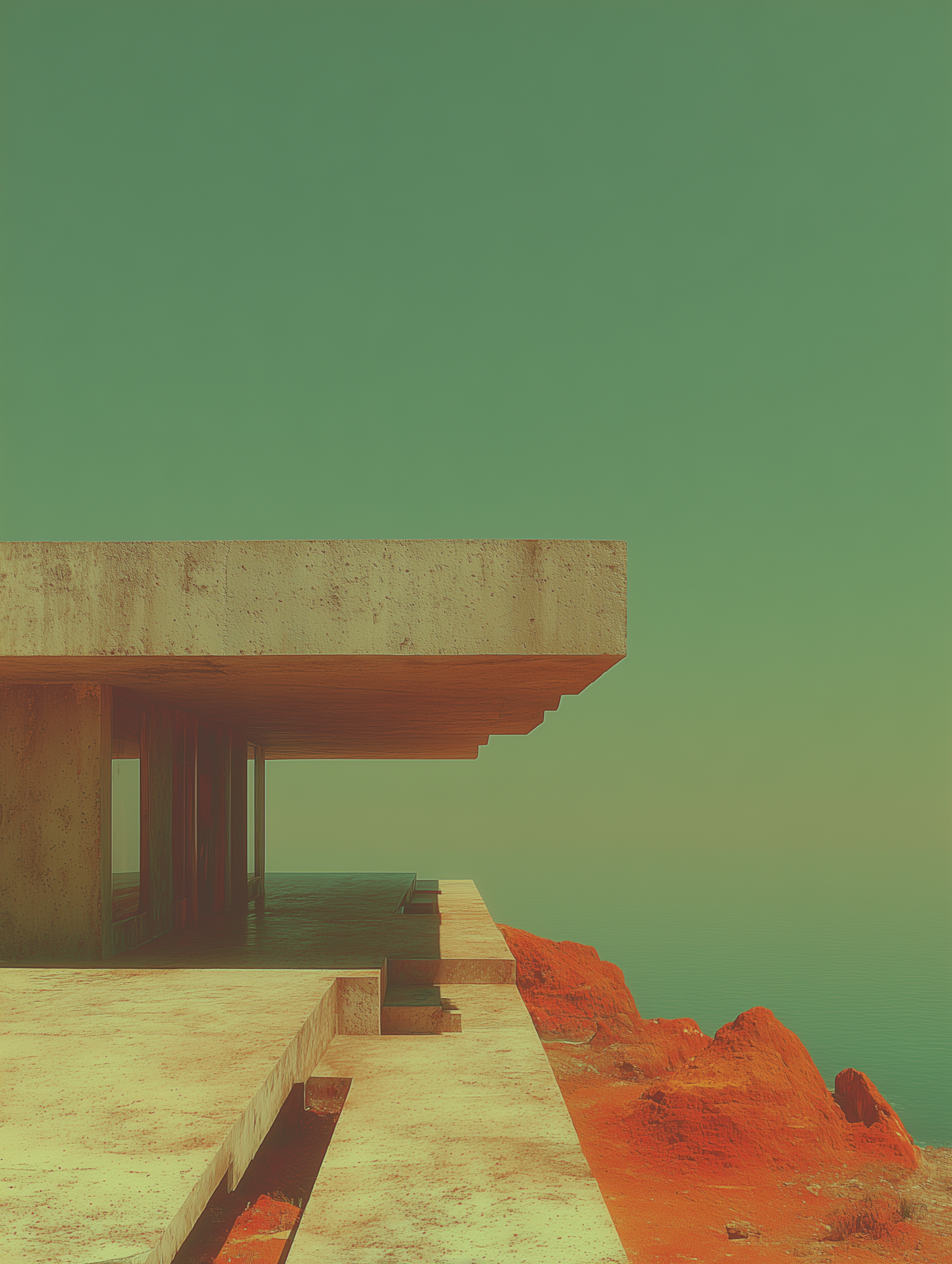 Modern concrete architecture on a red cliff under a surreal green sky, overlooking a tranquil sea. A striking blend of design and nature.