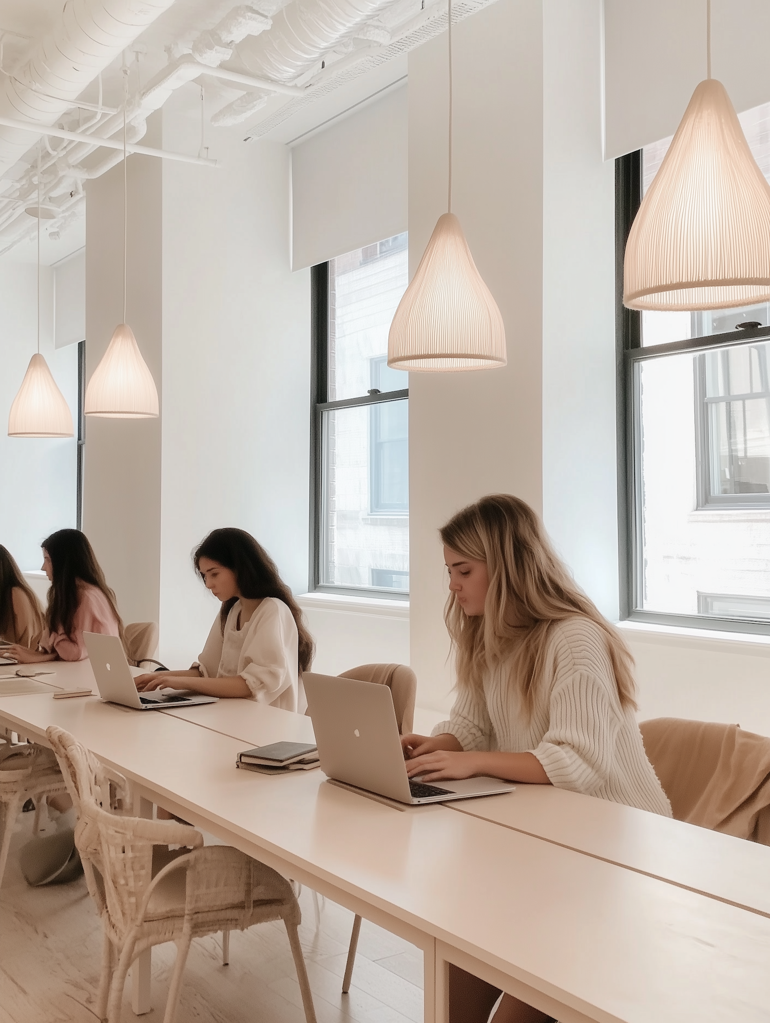 Modern office with young women working on laptops, bright natural light, minimalist decor, and stylish pendant lighting.