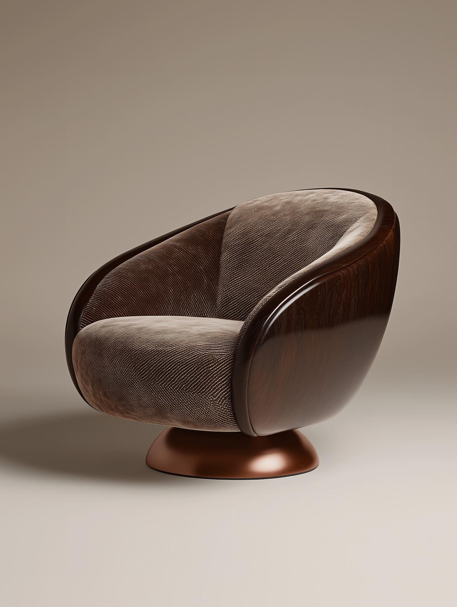 Modern armchair with a dark wooden frame, beige textured upholstery, and a bronze circular base. Perfect for stylish, cozy interiors.