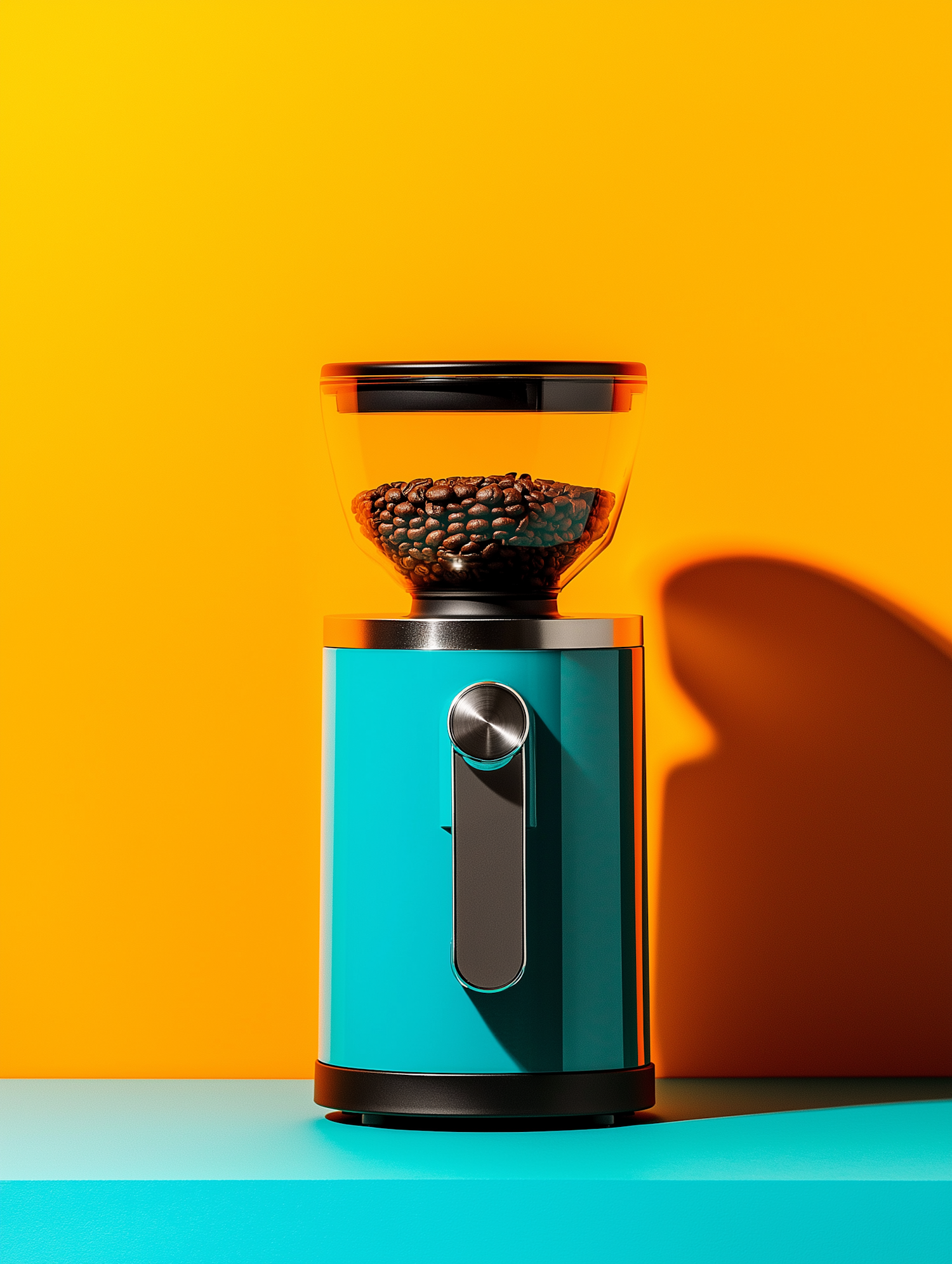 Sleek turquoise coffee grinder with a transparent bean chamber, set against a bold yellow background. Perfect for modern kitchen vibes.