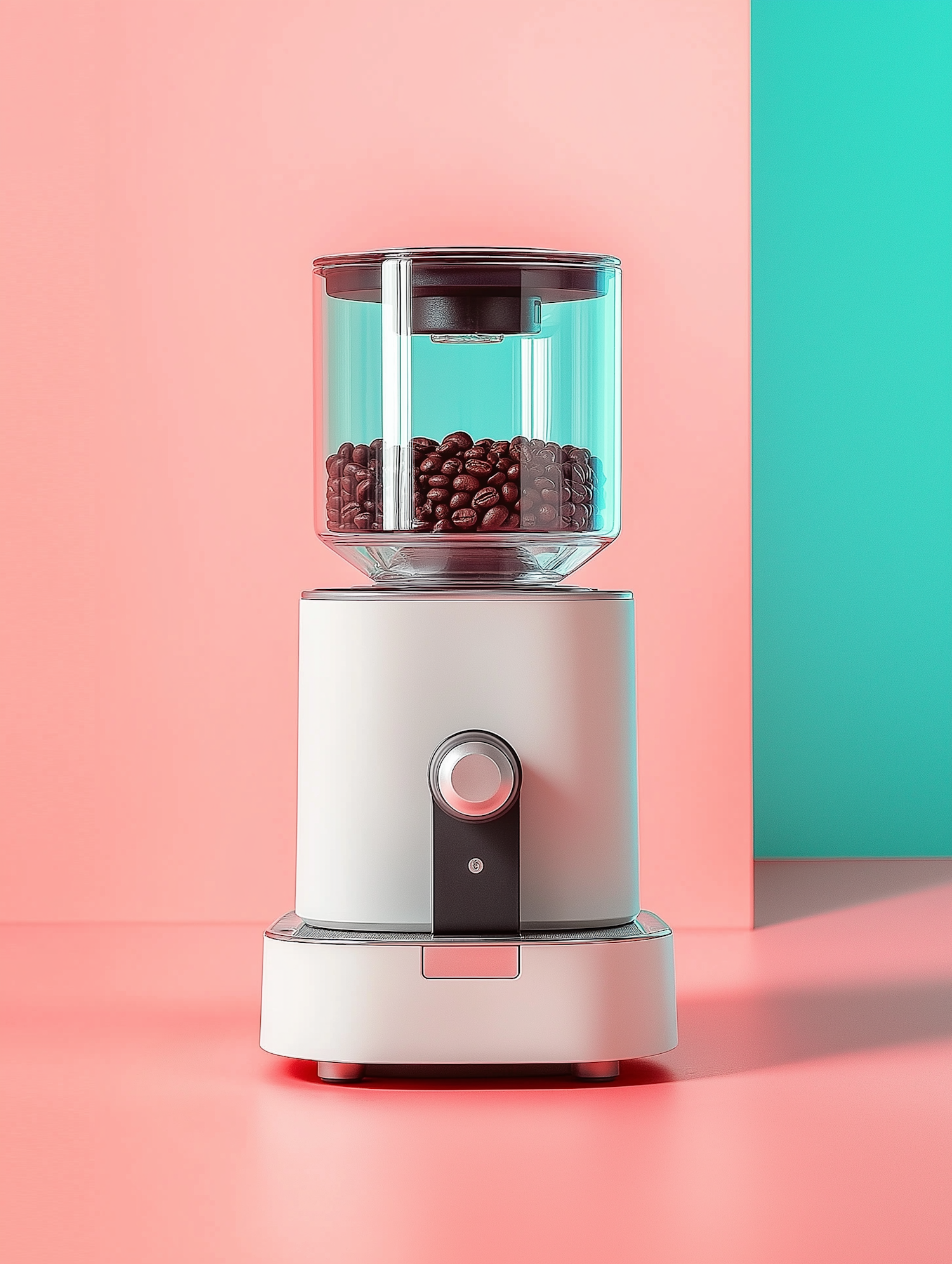 Modern coffee grinder with a white base and transparent chamber filled with beans, set against a vibrant pink and teal background.