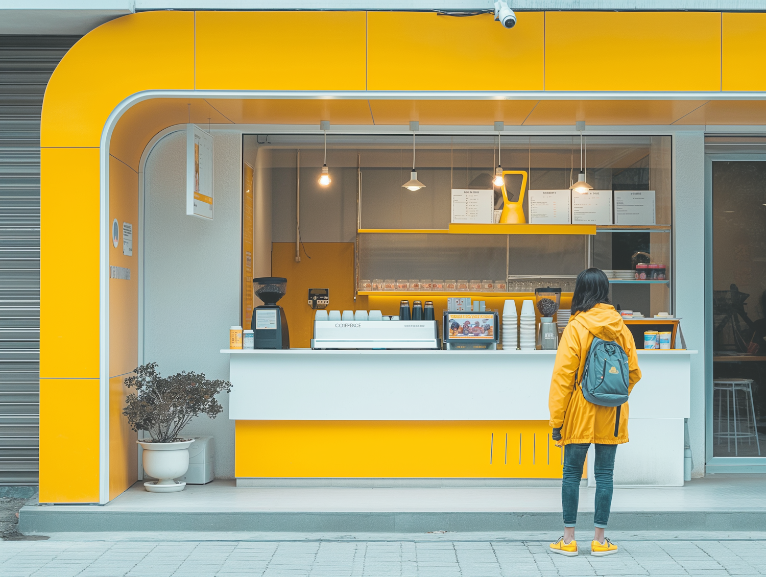 Modern coffee stand with bright yellow accents. A woman in a yellow jacket stands in front, creating a vibrant, cohesive scene.