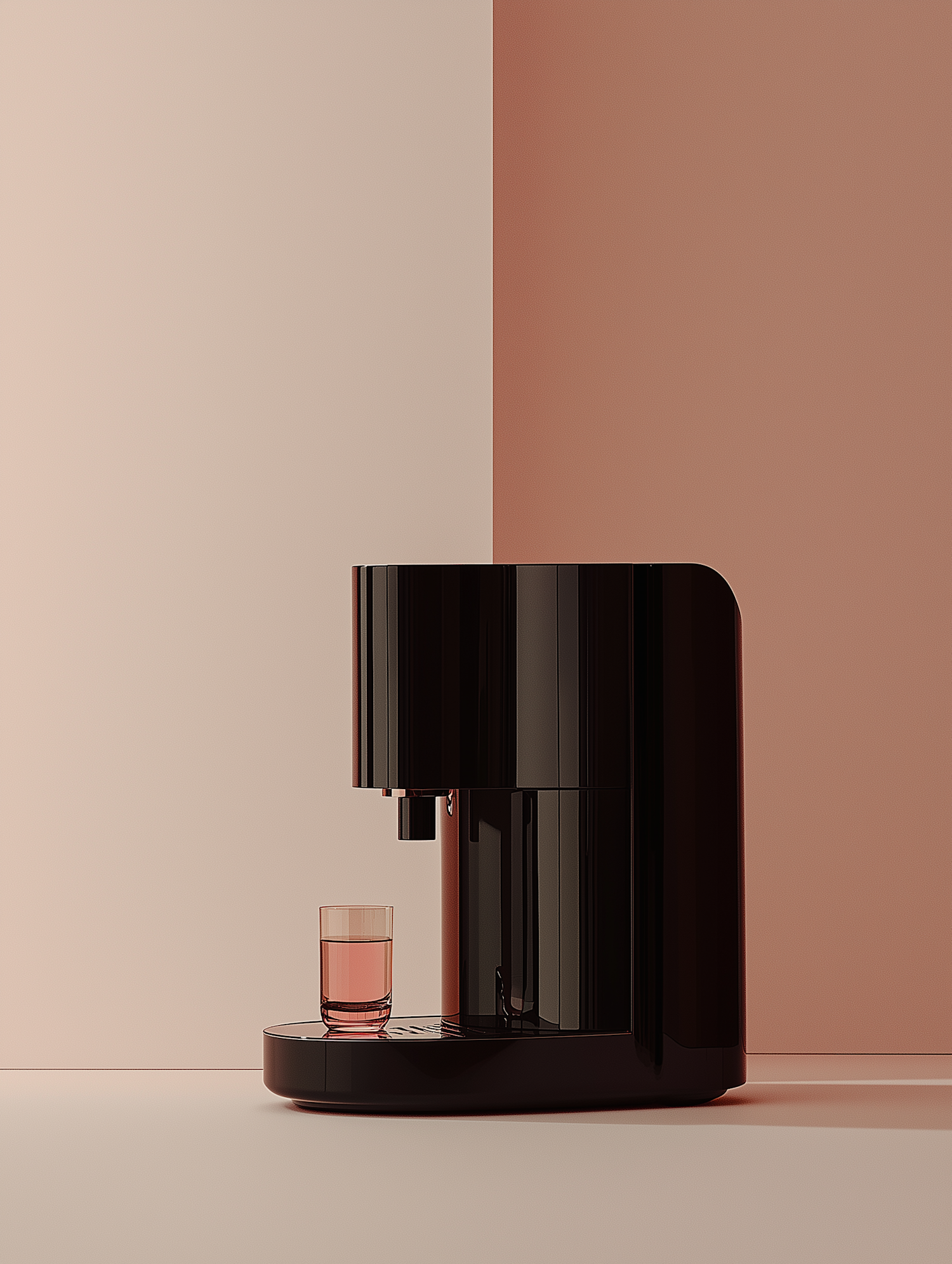 Sleek black coffee machine with a pink drink in a glass, set against a beige and terracotta background.