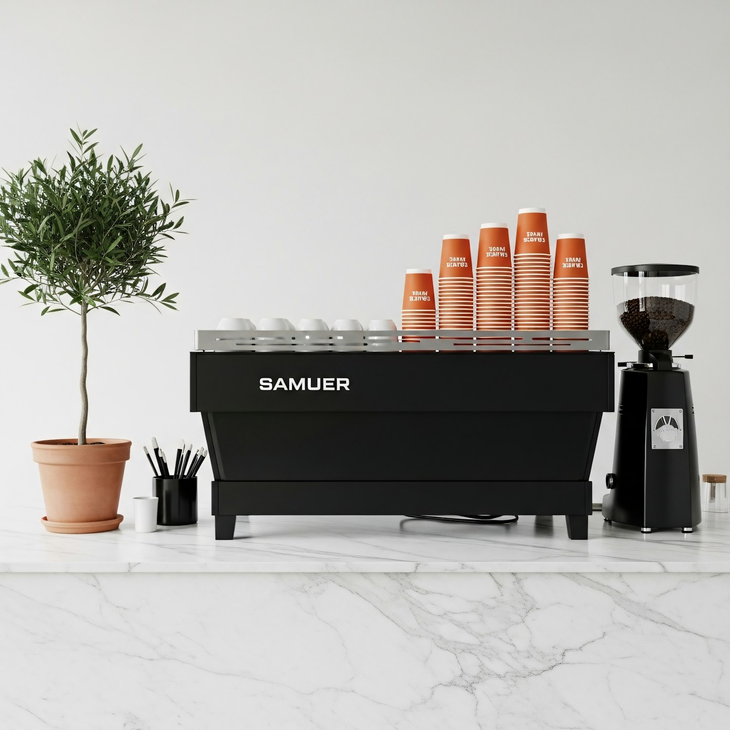 Modern coffee setup with a sleek espresso machine, grinder, and potted plant on a white marble counter.