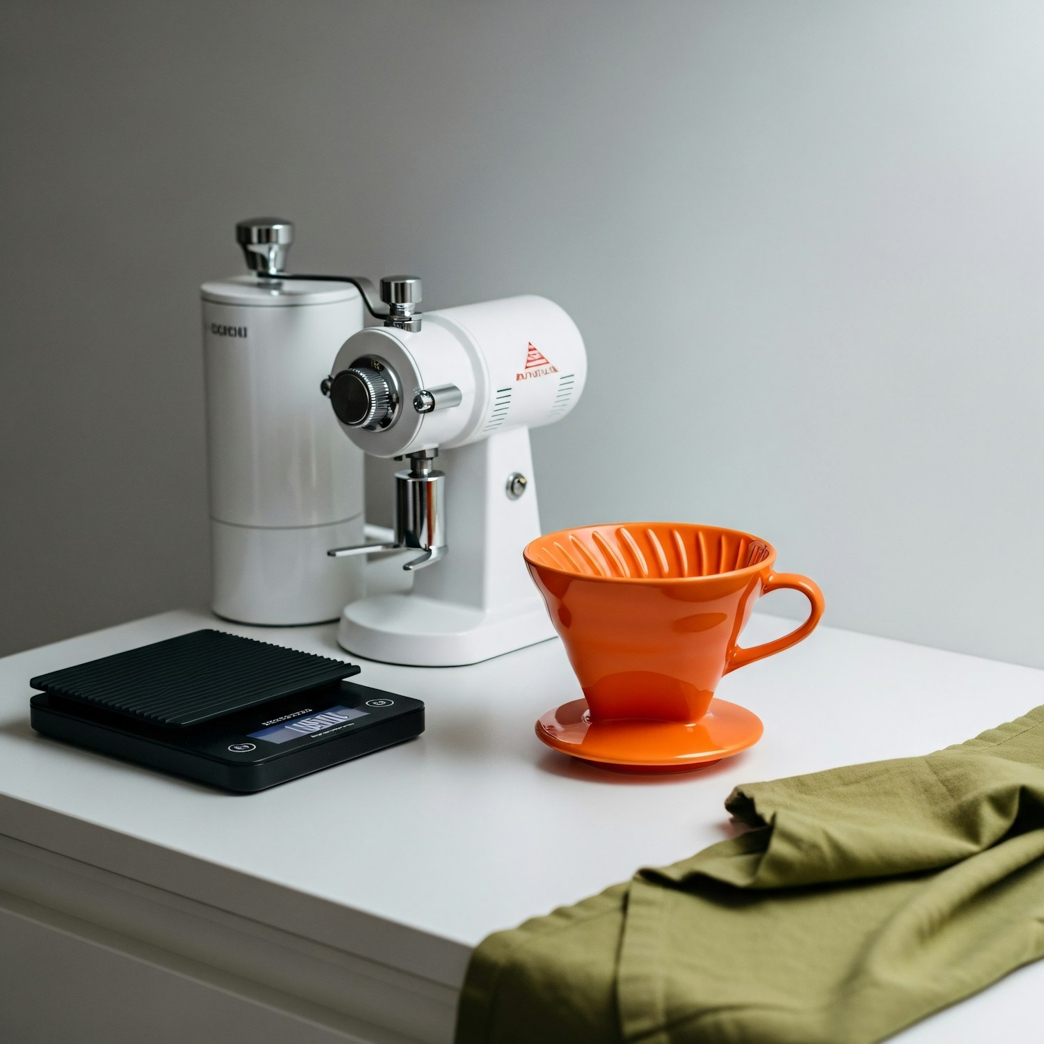 Modern coffee brewing setup with a white grinder, orange pour-over dripper, and black digital scale on a clean white surface.