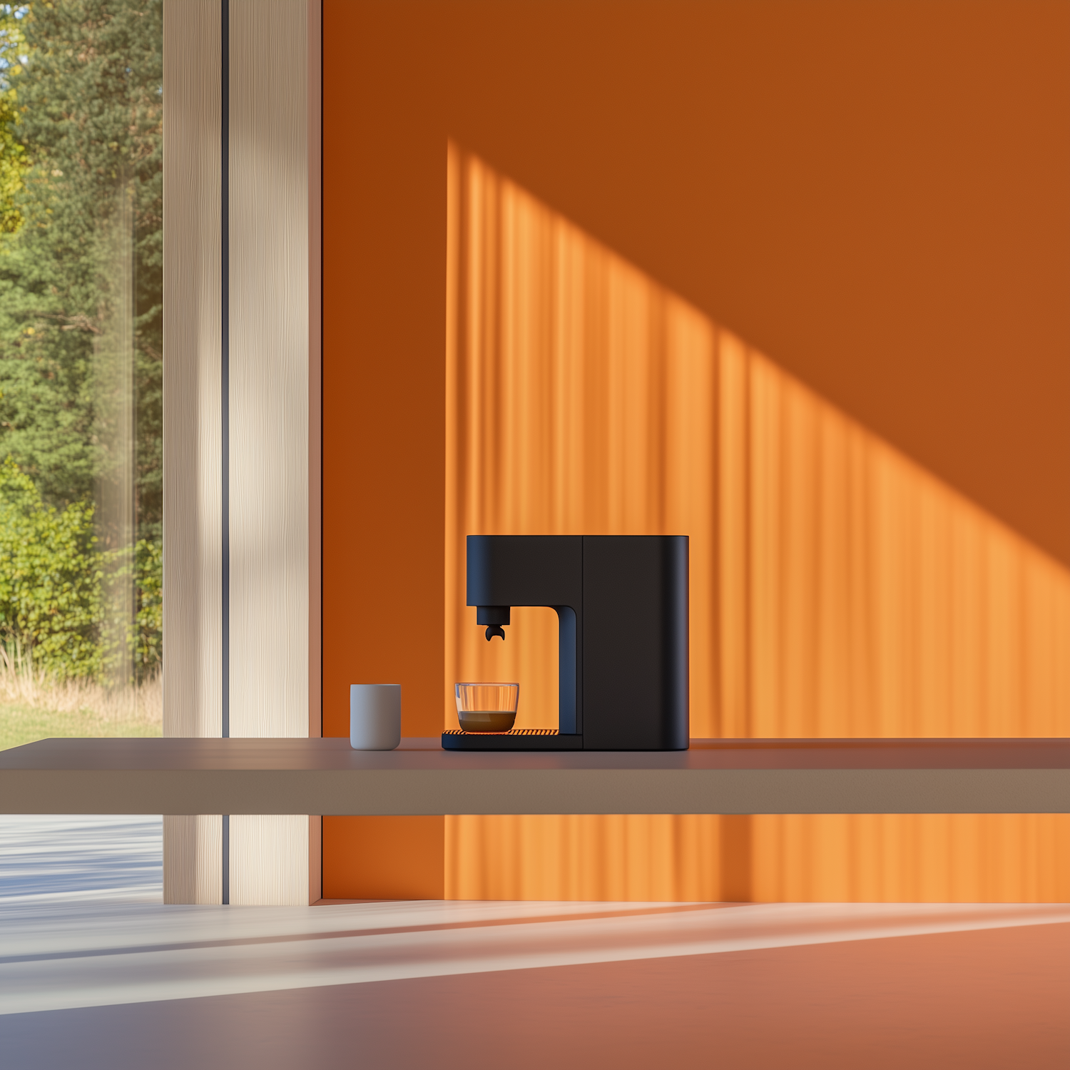 Minimalist black coffee machine on a beige counter, set against an orange wall with sunlight and a view of greenery through a window.