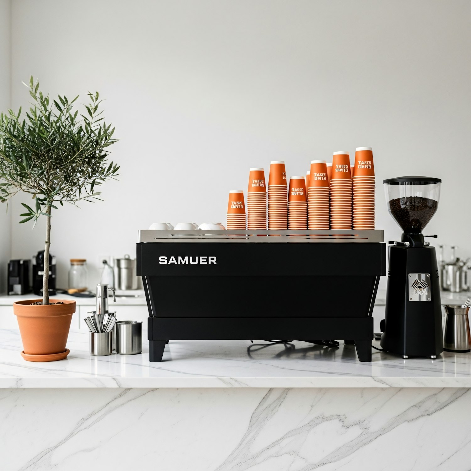 Minimalist coffee shop counter with a sleek espresso machine, orange cups, a coffee grinder, and a potted olive tree on a marble surface.