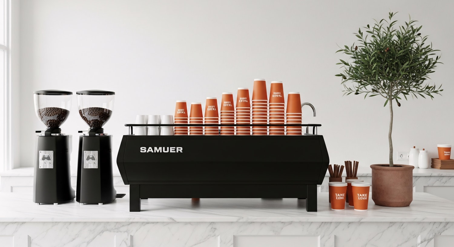 Modern coffee counter with a sleek espresso machine, coffee grinders, and neatly stacked orange cups, complemented by a potted olive tree.