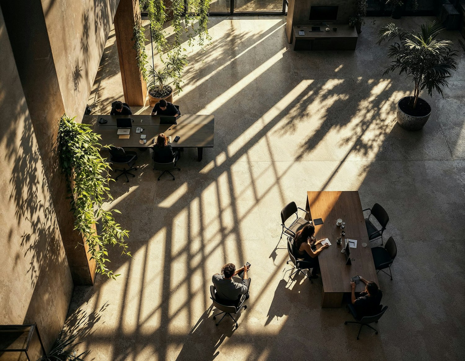 Modern office with natural light, greenery, and people working at wooden tables. Warm, earthy tones create a calm, focused atmosphere.