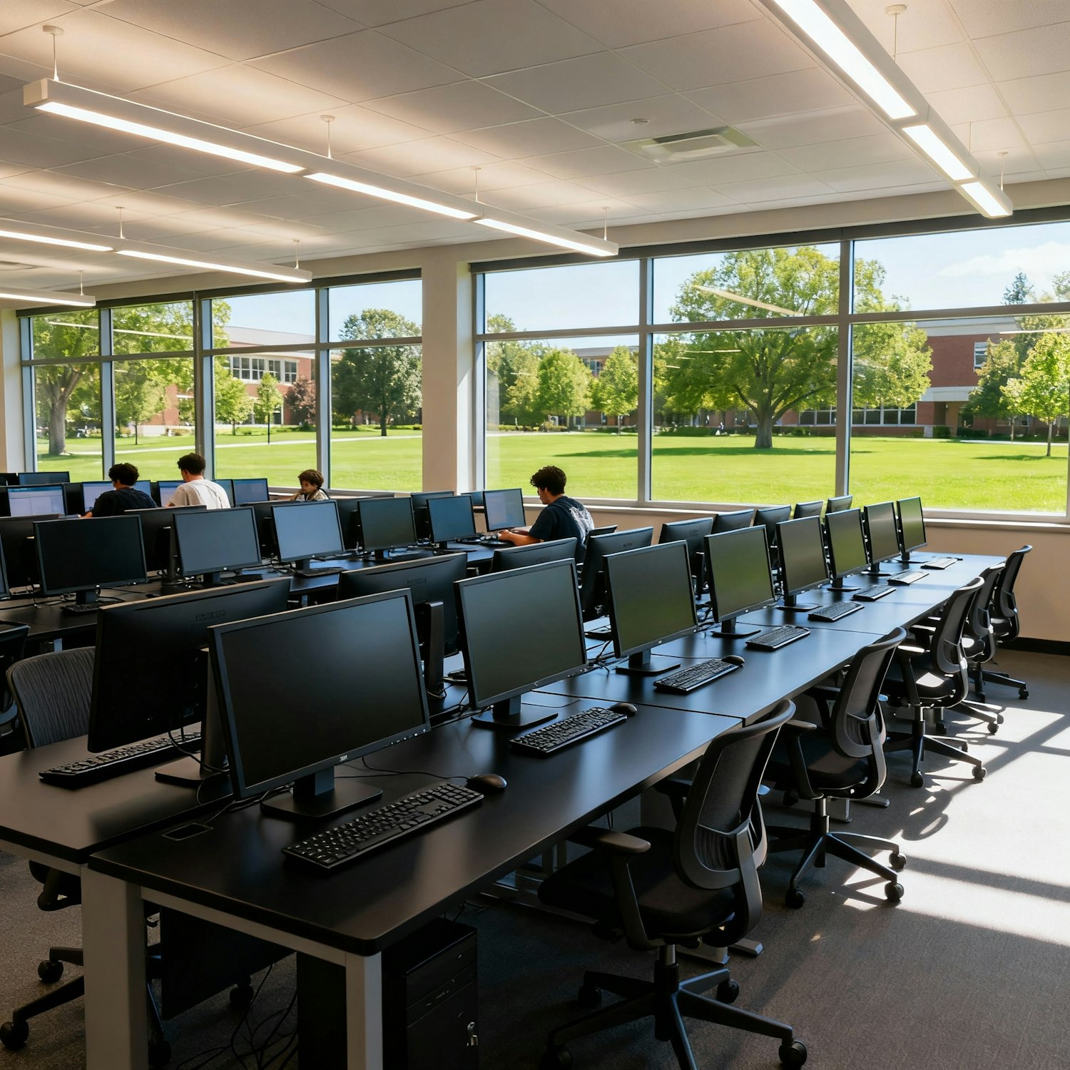 A bright computer lab with rows of monitors, large windows, and a view of a green campus lawn, creating a productive atmosphere.