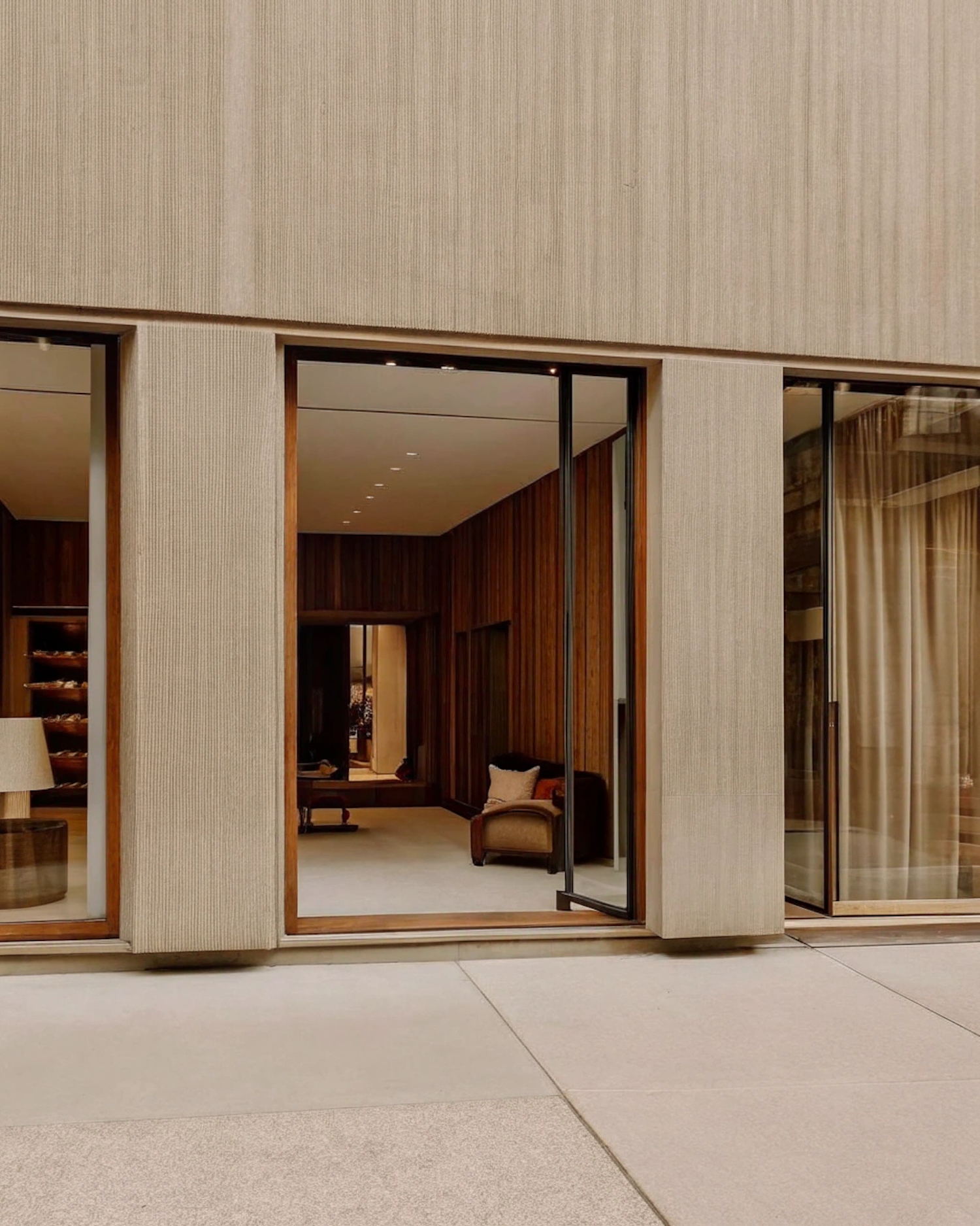 Modern beige concrete facade with large glass windows, wooden frames, and a warm minimalist interior featuring wood paneling and neutral furniture.