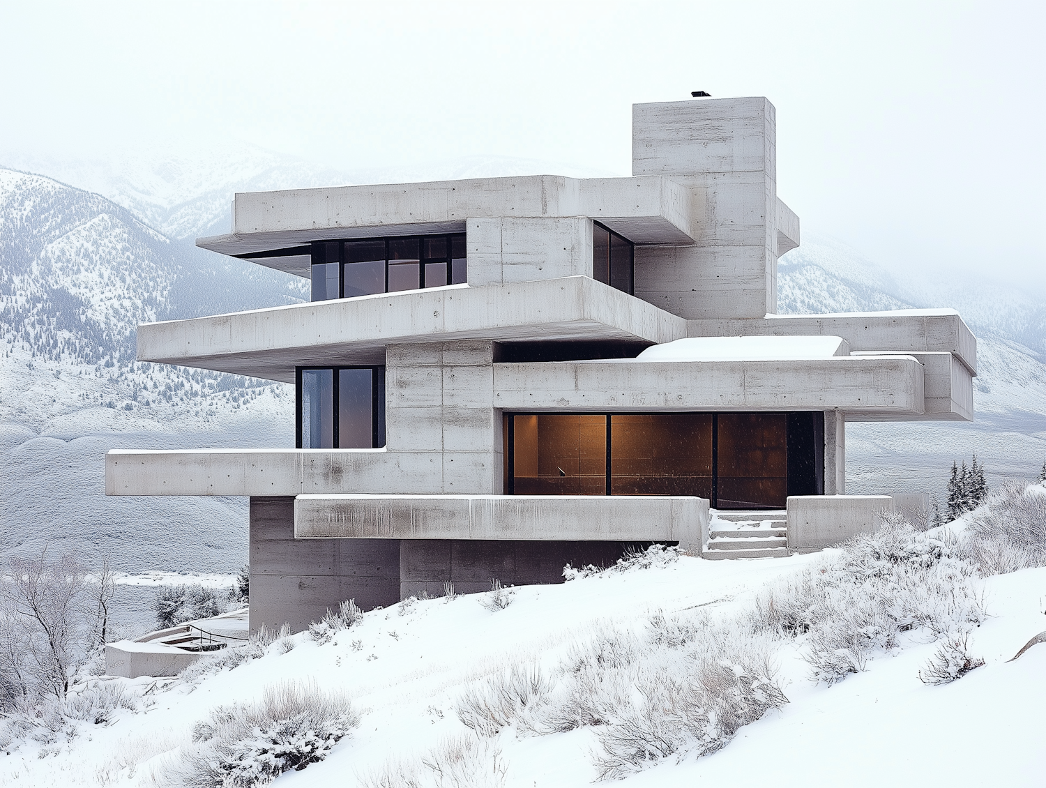 Modern concrete house in snowy landscape with mountain backdrop, featuring angular design and large windows.