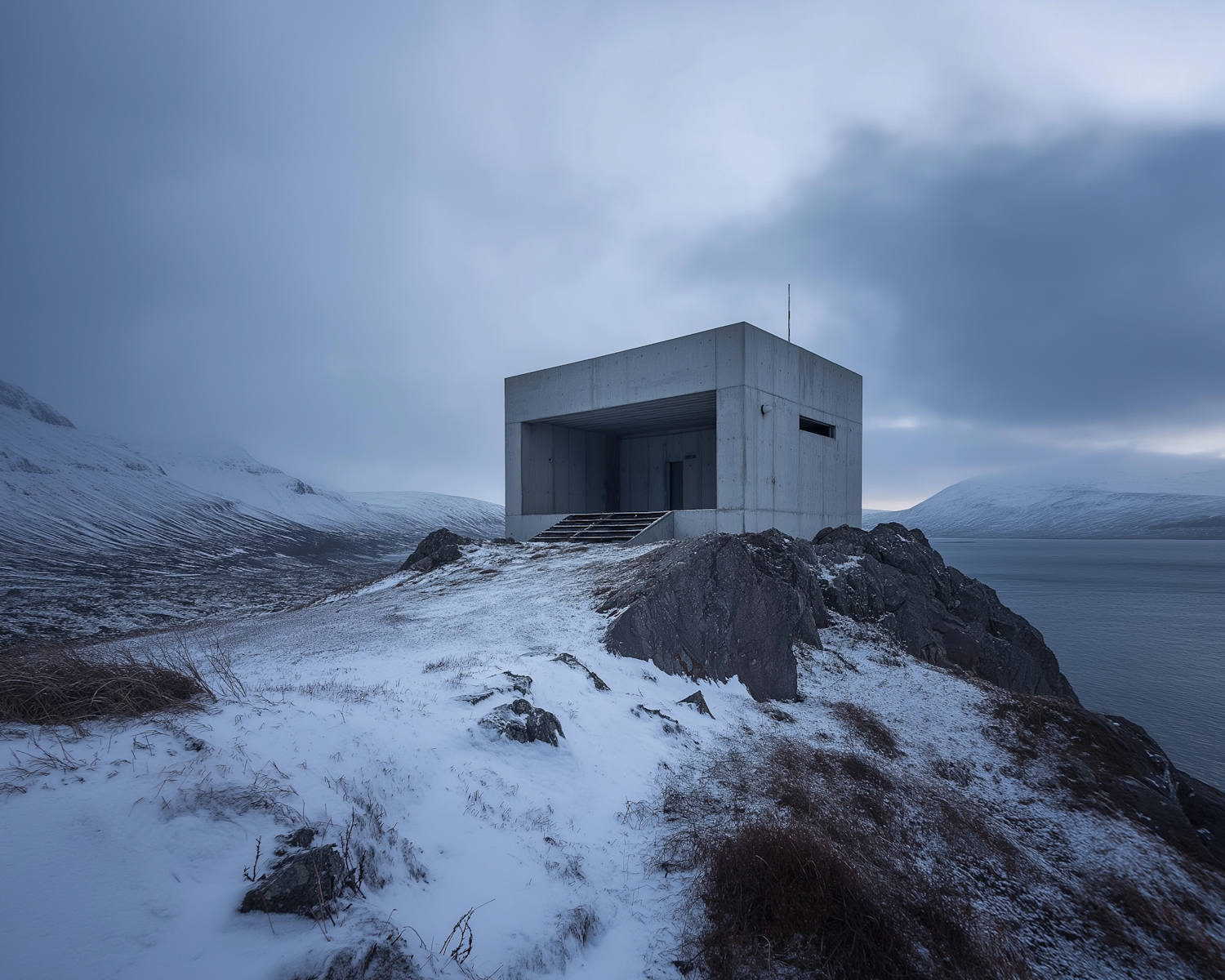 Minimalist concrete building on a snowy hill, overlooking a serene lake and surrounded by moody, overcast skies and distant mountains.