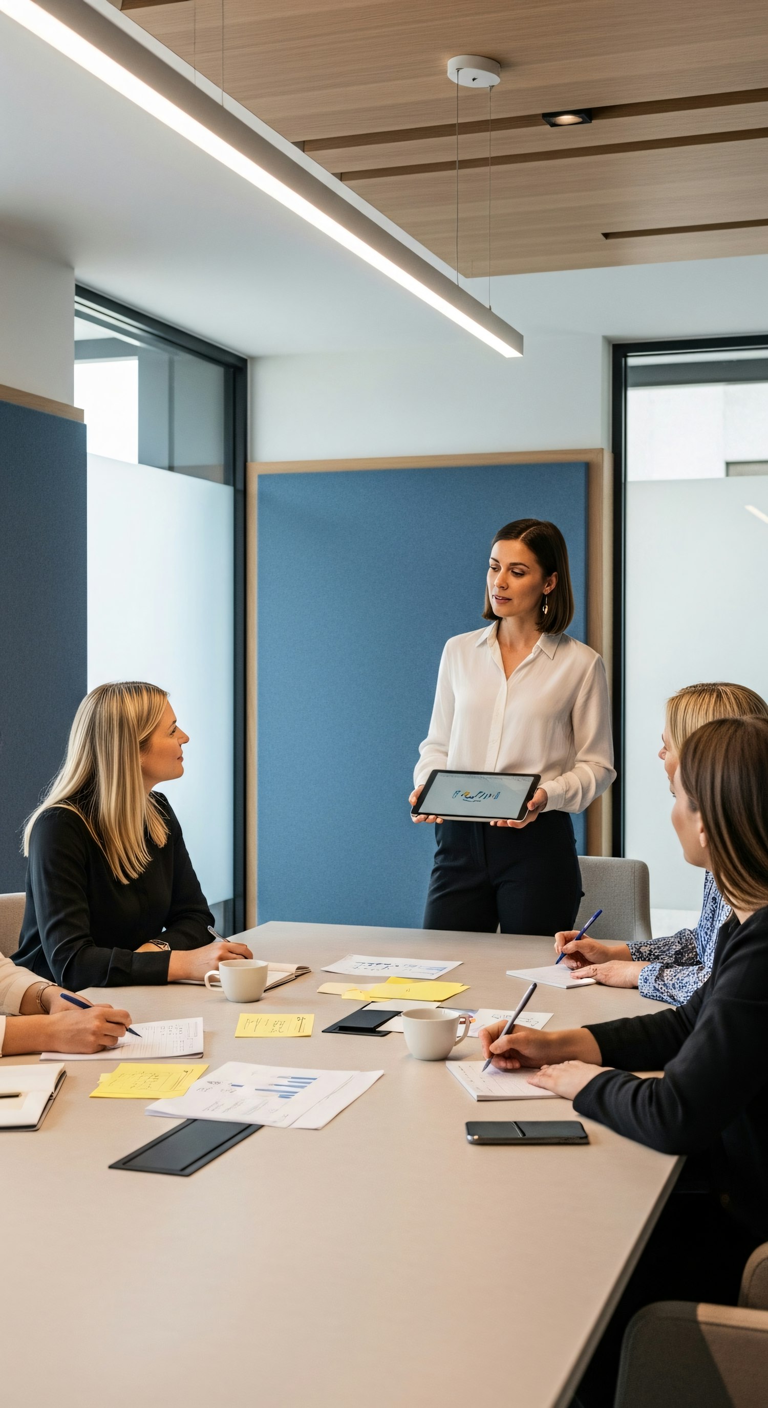 A professional team collaborates in a modern conference room, with a presenter using a tablet and others engaged in discussion.