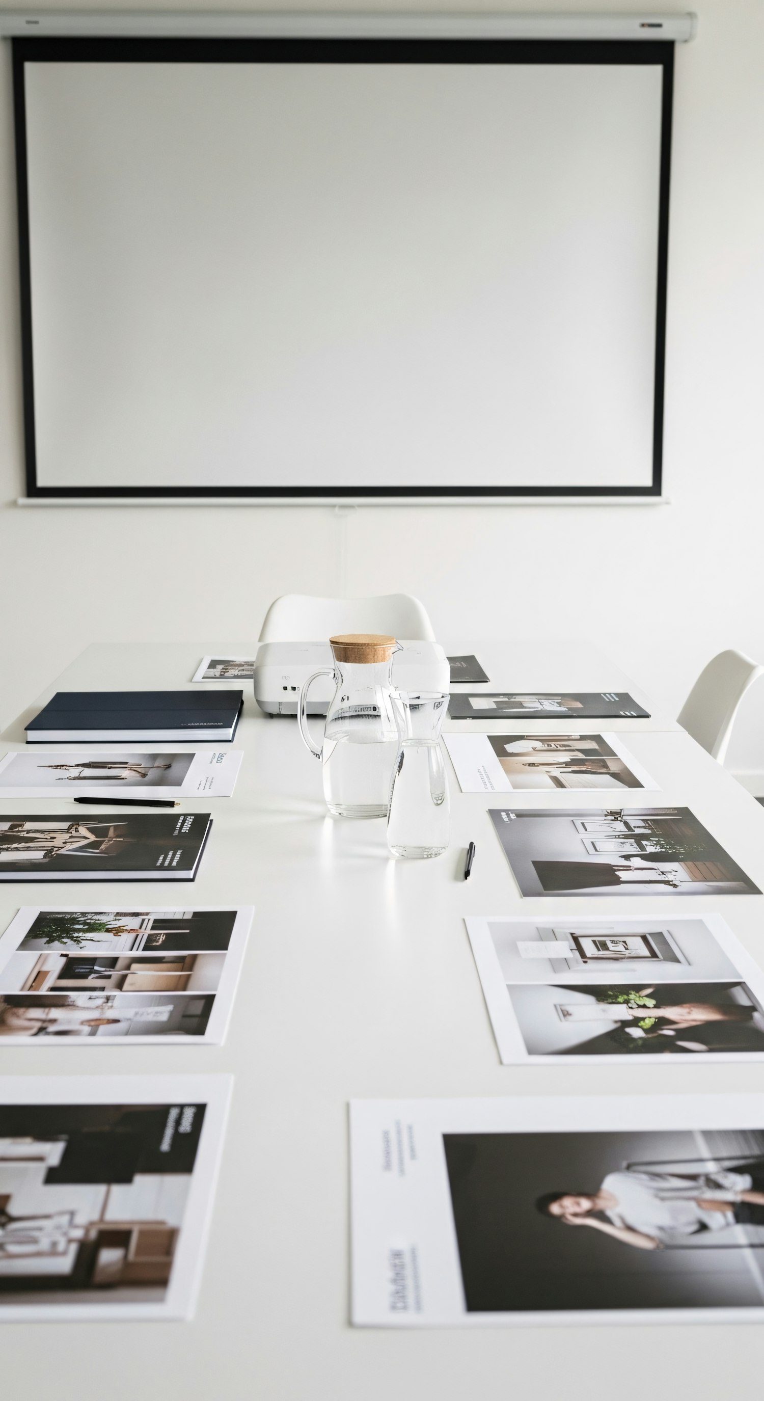 Minimalist conference room setup with a white table, printed materials, a water pitcher, and a projector screen in the background.