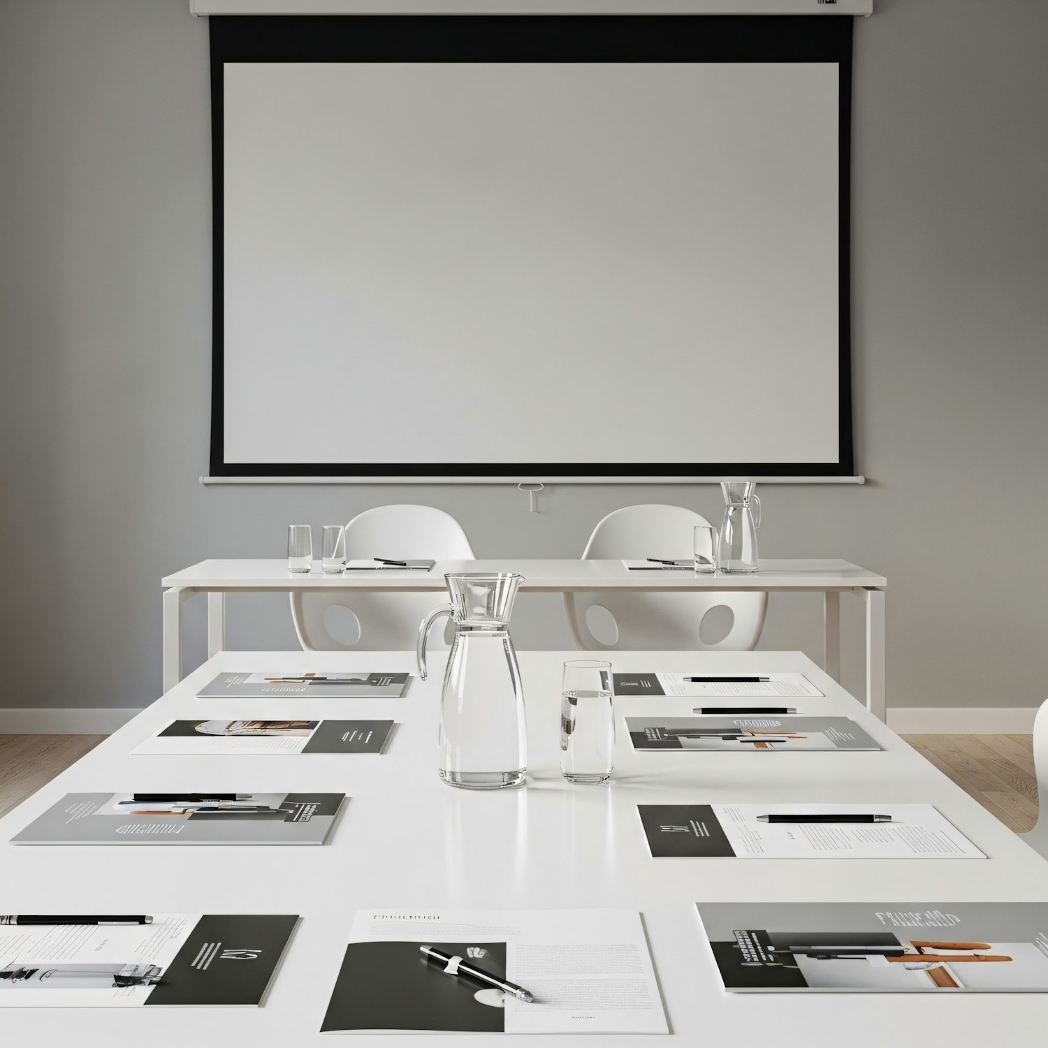 Modern conference room setup with white tables, chairs, and a projection screen, featuring neatly arranged documents and water pitchers.