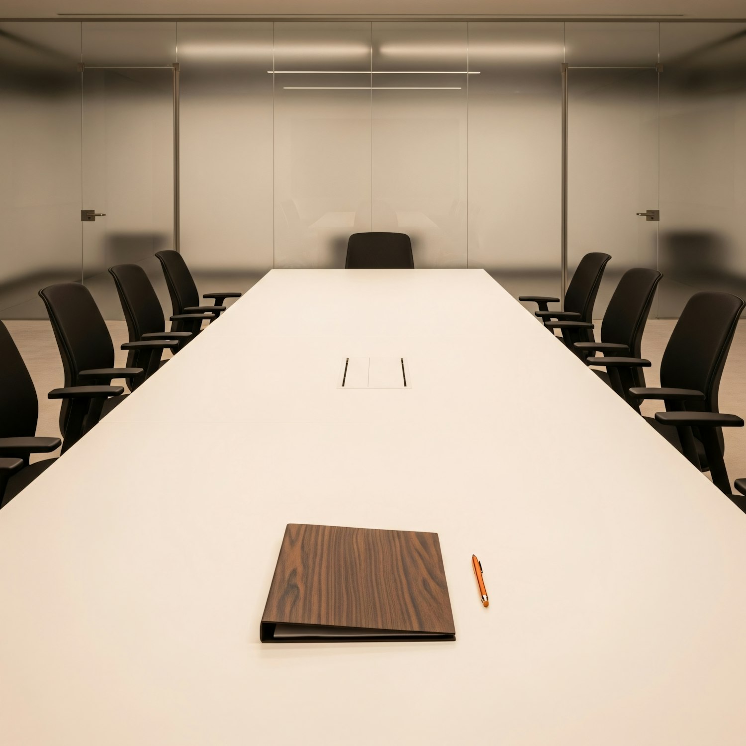 A sleek conference room with a long white table, black chairs, and frosted glass walls, featuring a wooden folder and pen on the table.