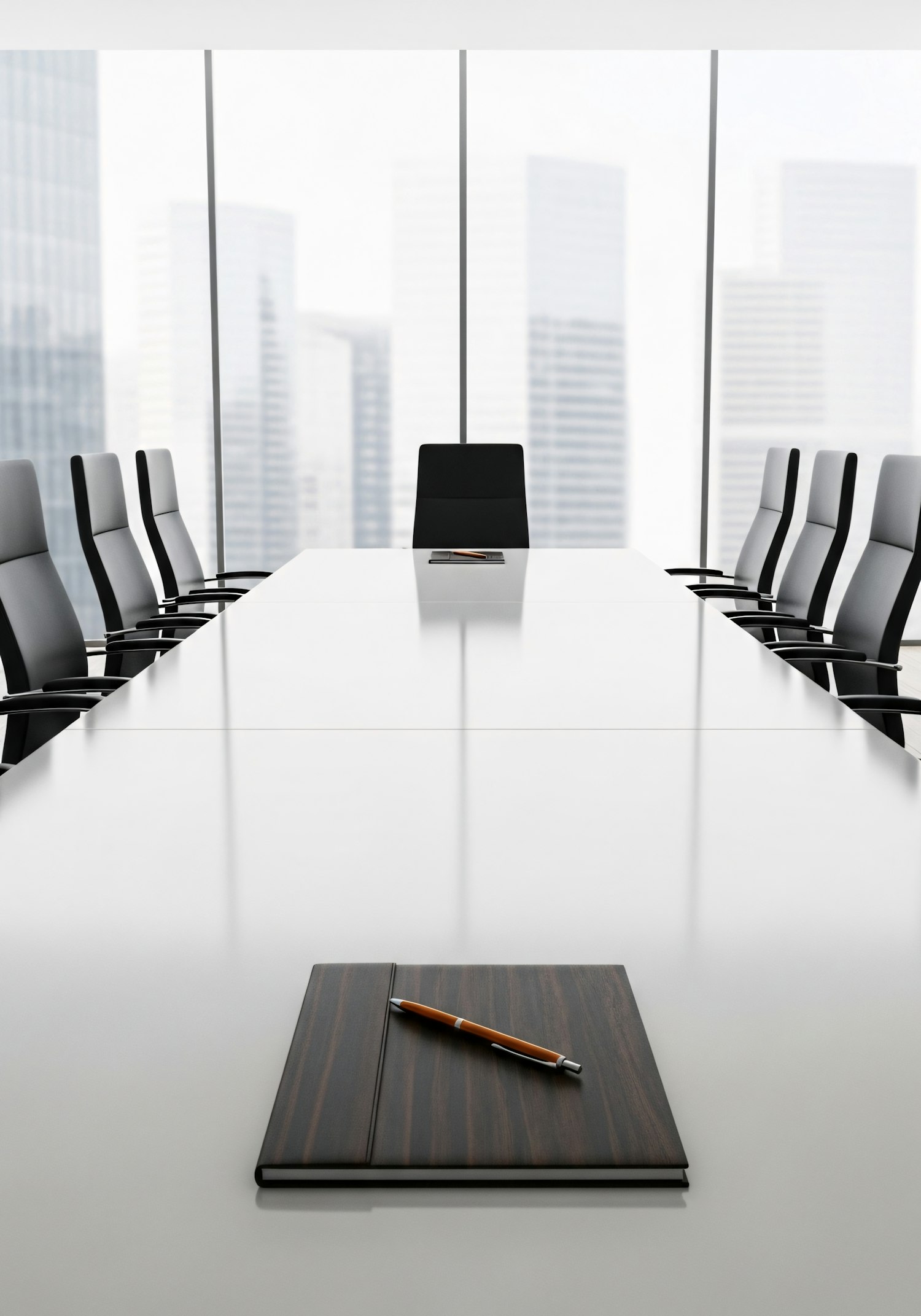 A sleek conference room with a long white table, modern chairs, and a city view through large windows, featuring a notebook and pen.