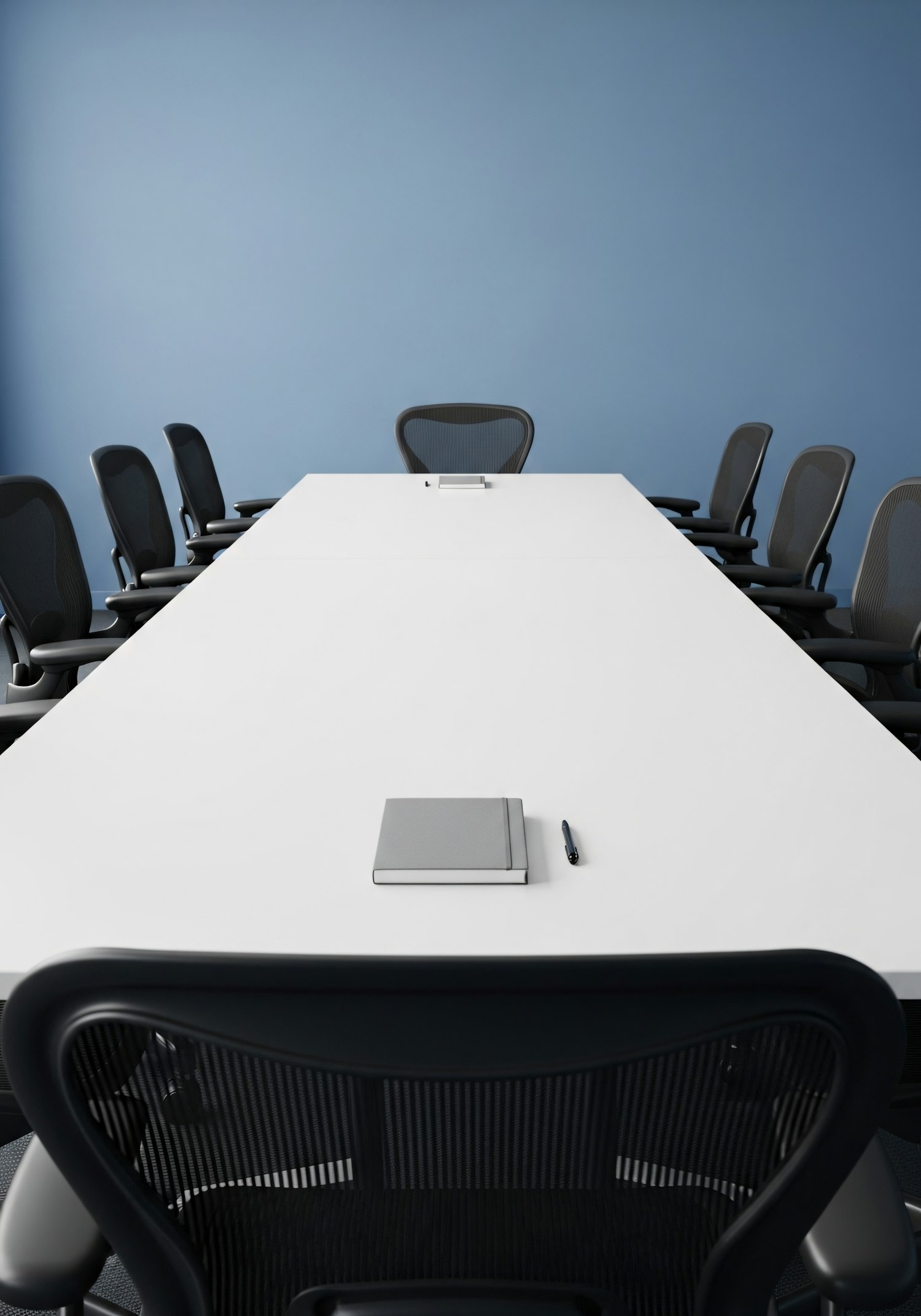 A modern conference room with a white table, black chairs, and a blue wall, featuring a notebook and pen for a professional setting.