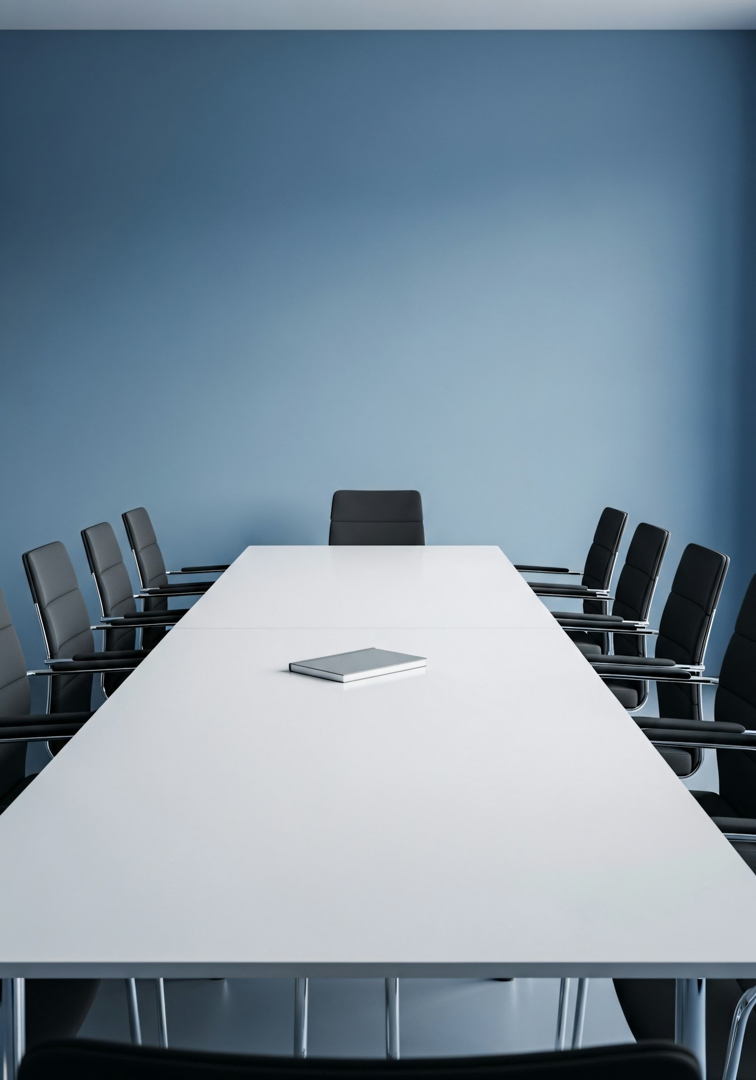 A modern conference room with a white table, black chairs, and a blue wall, featuring a notebook on the table.