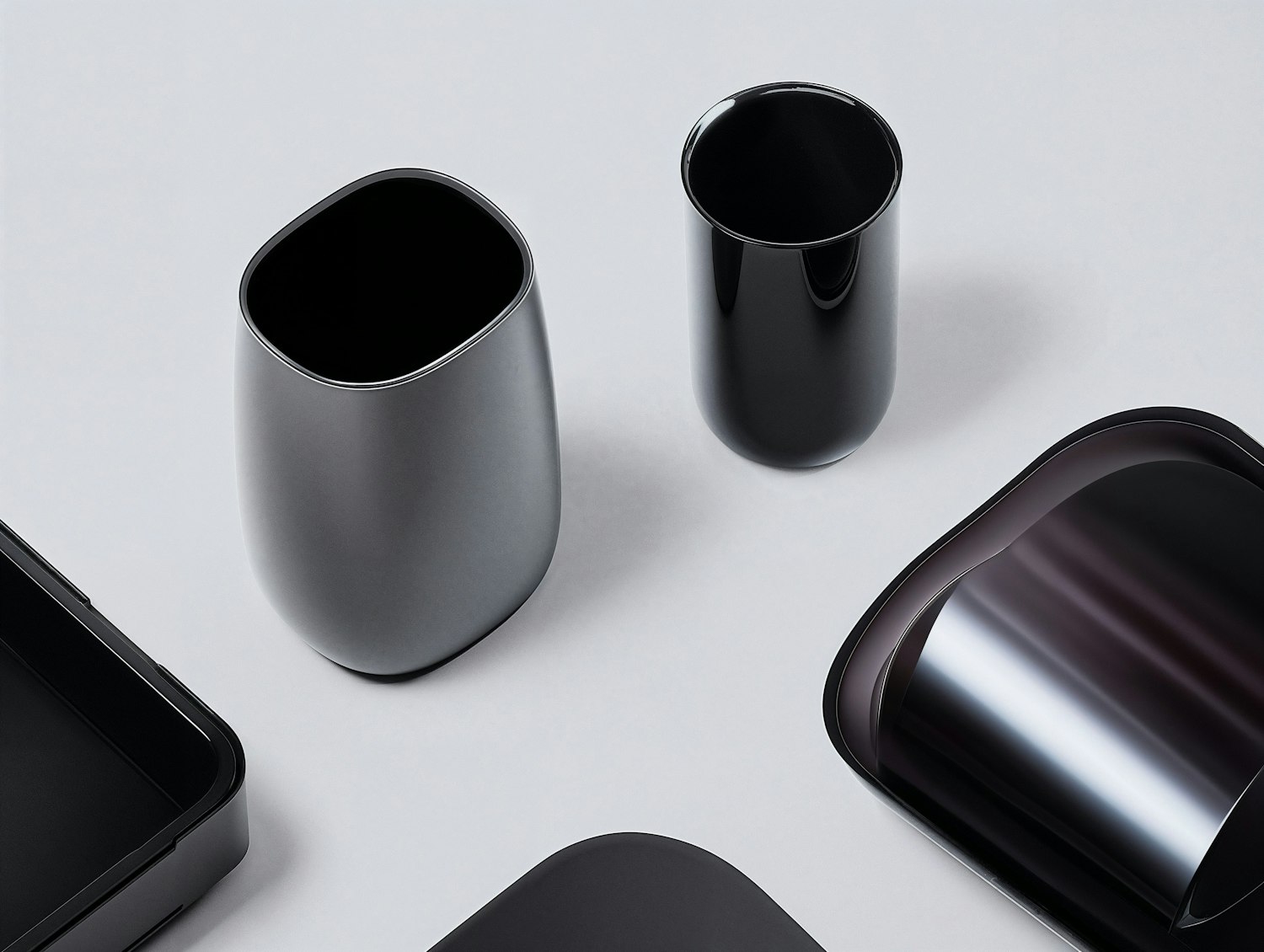 Sleek modern containers and trays in black and gray on a light gray surface, showcasing minimalist design and elegance.