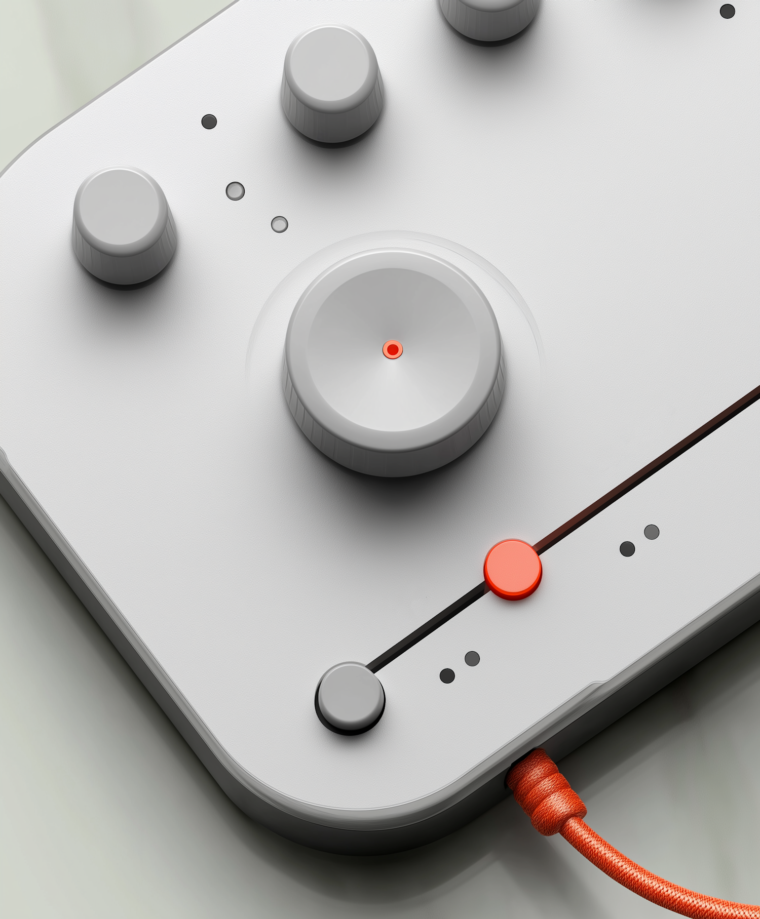 Minimalist control panel with knobs, slider, and orange braided cable. Sleek design with light gray surface and red accents.