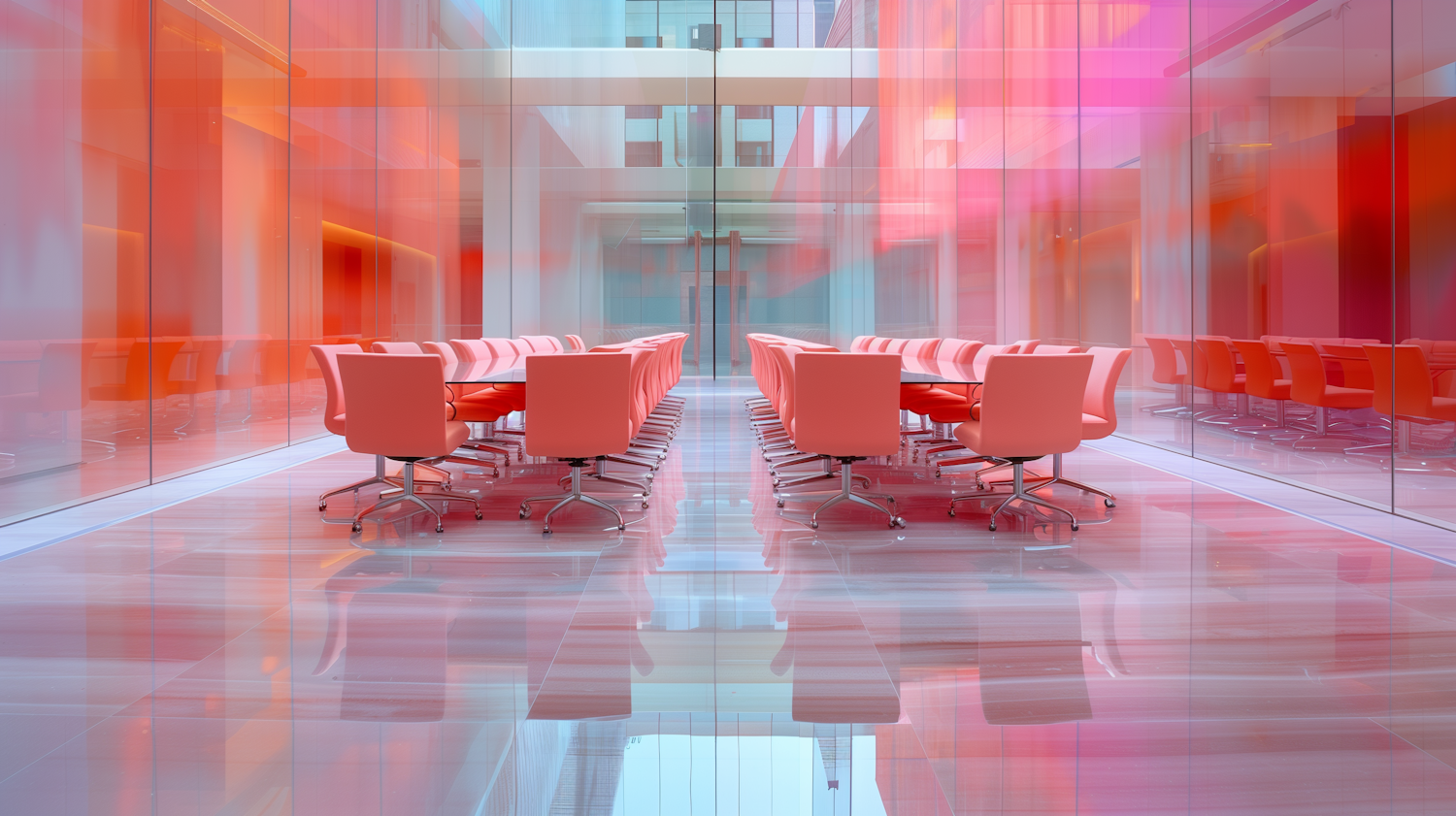 Modern conference room with pink chairs, glass walls, and reflective floors, creating a vibrant and stylish atmosphere.