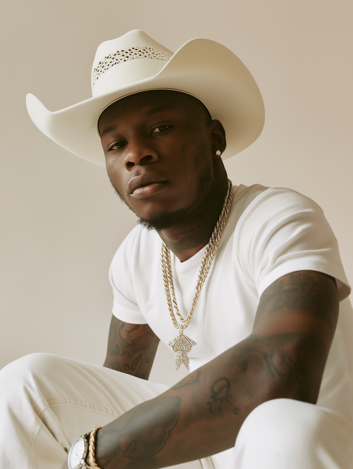 Stylish man in a white cowboy hat and gold chains, exuding confidence with a monochromatic outfit and tattooed arms.