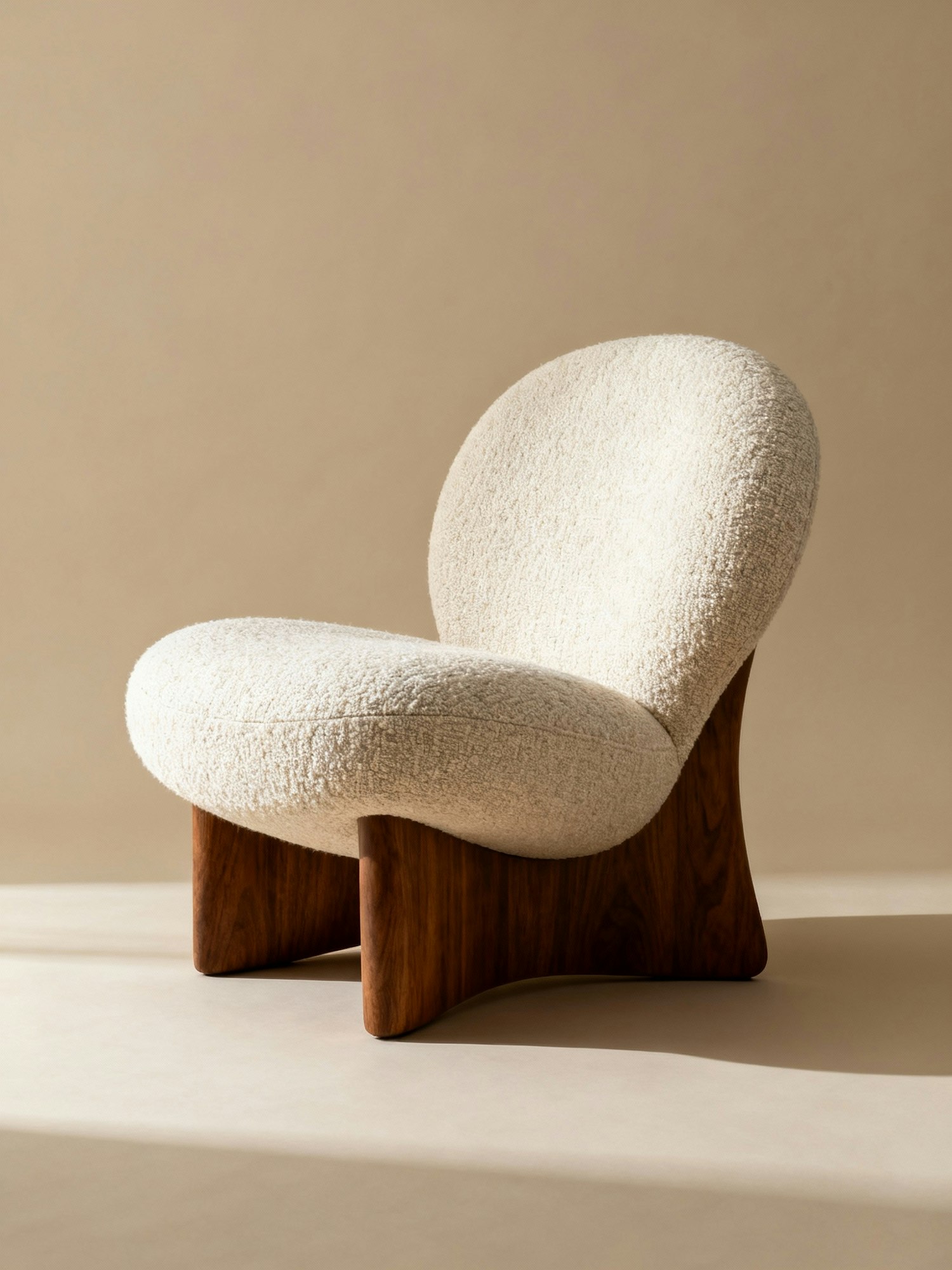 Professional interior design photography, warm and textured atmosphere, soft natural lighting, retro-modern aesthetic, mid-century inspired furniture, crafted wooden details, neutral tones with accents of earthy colors, editorial style, timeless and sophisticated mood. A retro-modern armchair with organic curves, walnut wooden legs, and off-white boucle fabric upholstery. The chair has a rounded backrest, wide seat, and sculptural wooden base, designed in a timeless mid-century style. Studio photo on a plain beige background, captured from the side to show the profile and slope of the backrest, with shadows emphasizing the sculptural silhouette.