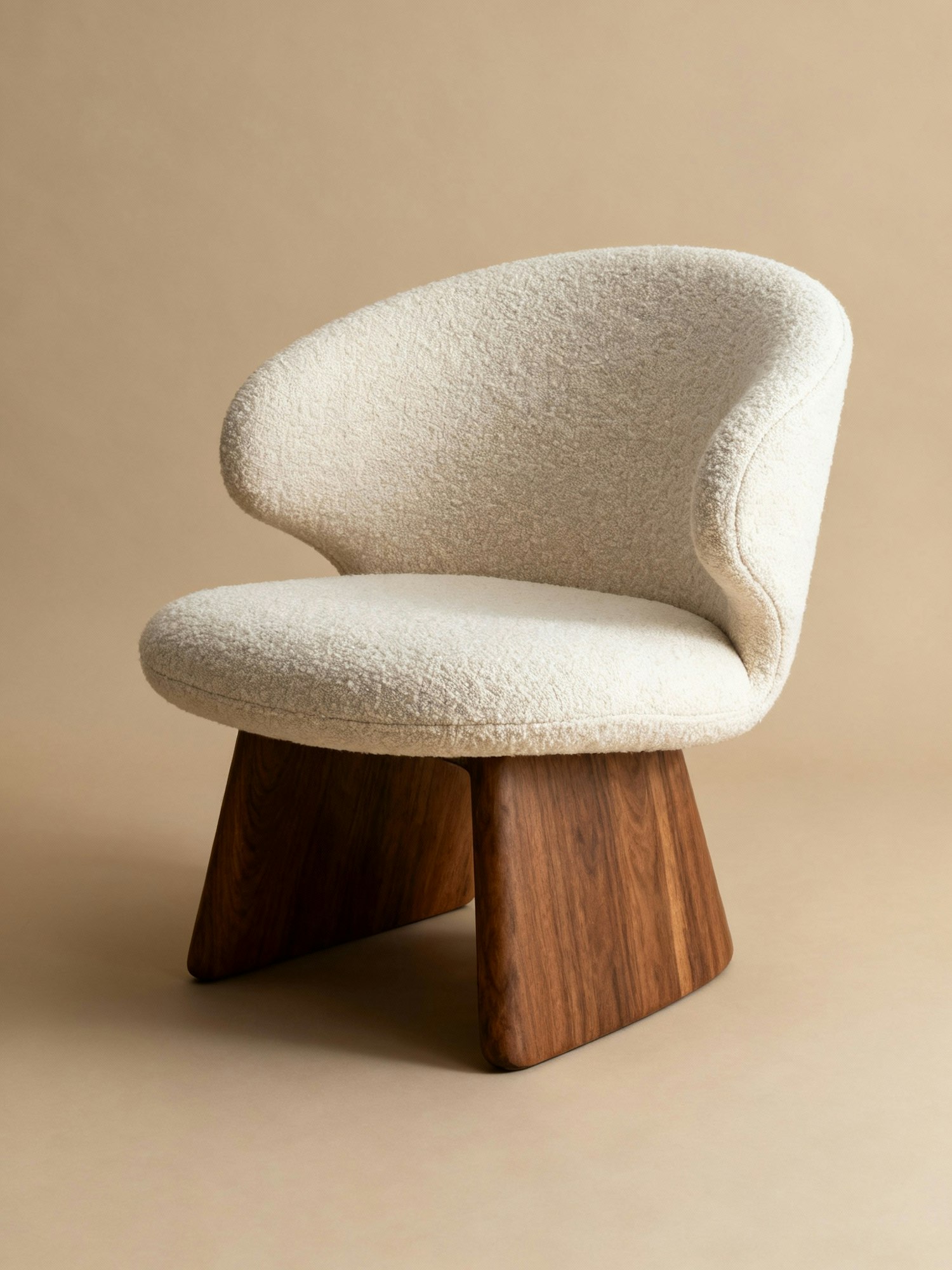 Professional interior design photography, warm and textured atmosphere, soft natural lighting, retro-modern aesthetic, mid-century inspired furniture, crafted wooden details, neutral tones with accents of earthy colors, editorial style, timeless and sophisticated mood. A retro-modern armchair with organic curves, walnut wooden legs, and off-white boucle fabric upholstery. The chair has a rounded backrest, wide seat, and sculptural wooden base, designed in a timeless mid-century style. Studio photo on a plain beige background, photographed from a 3/4 diagonal angle, highlighting the depth of the seat and curvature of the backrest.