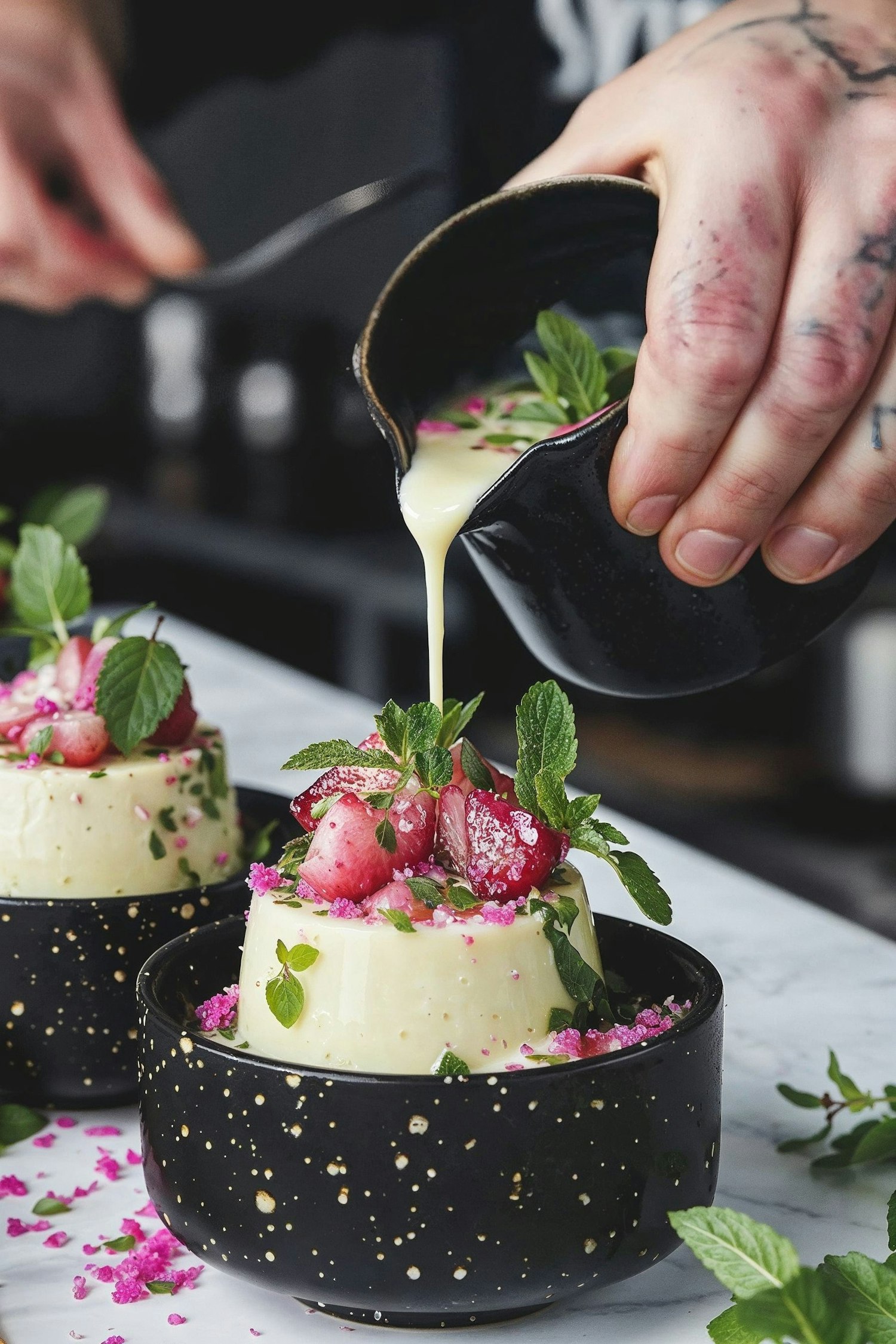Luxurious panna cotta with strawberries and mint, drizzled with creamy sauce. A tattooed hand adds a touch of elegance.