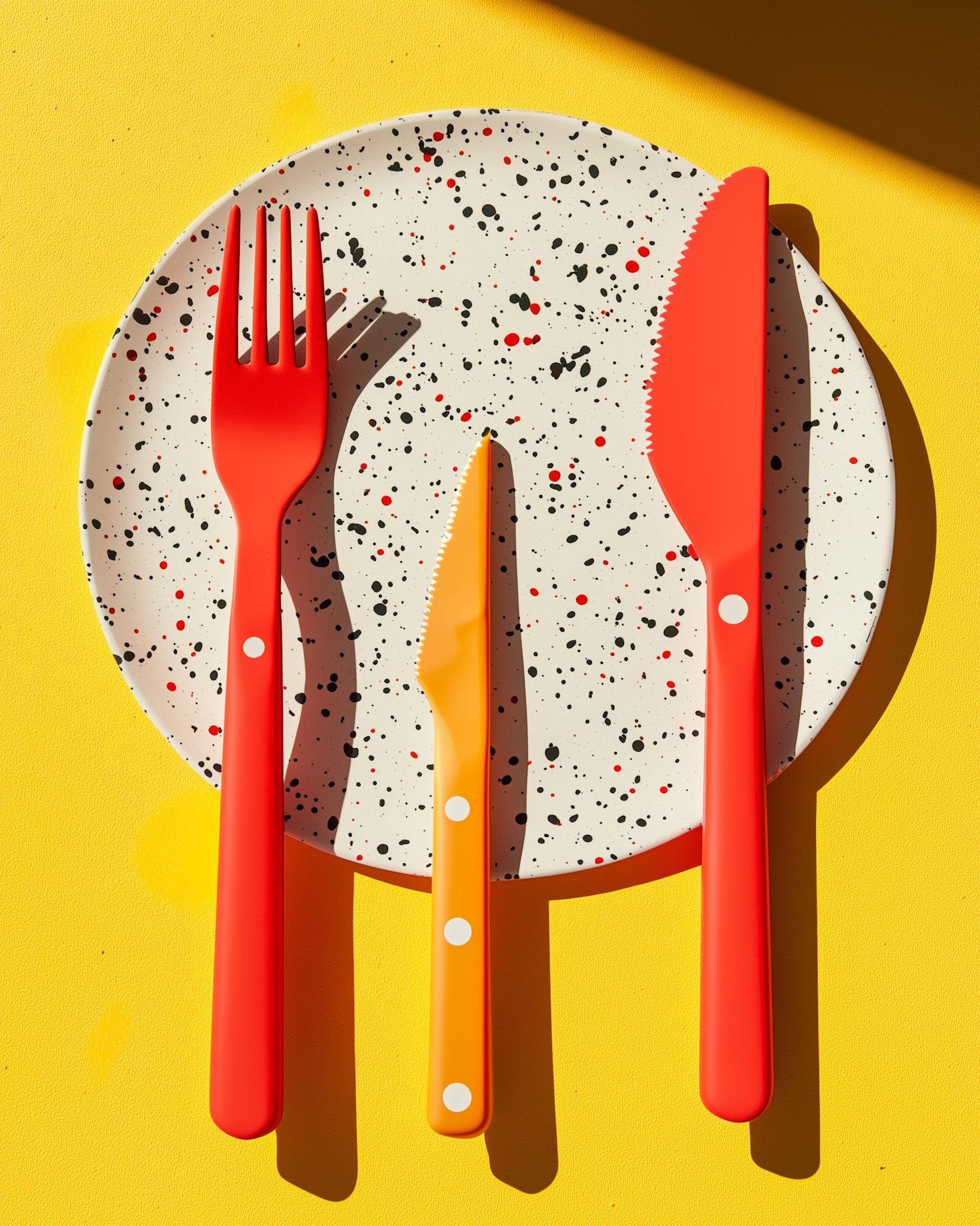 Colorful cutlery on a speckled plate against a bright yellow background, creating a vibrant and artistic dining scene.