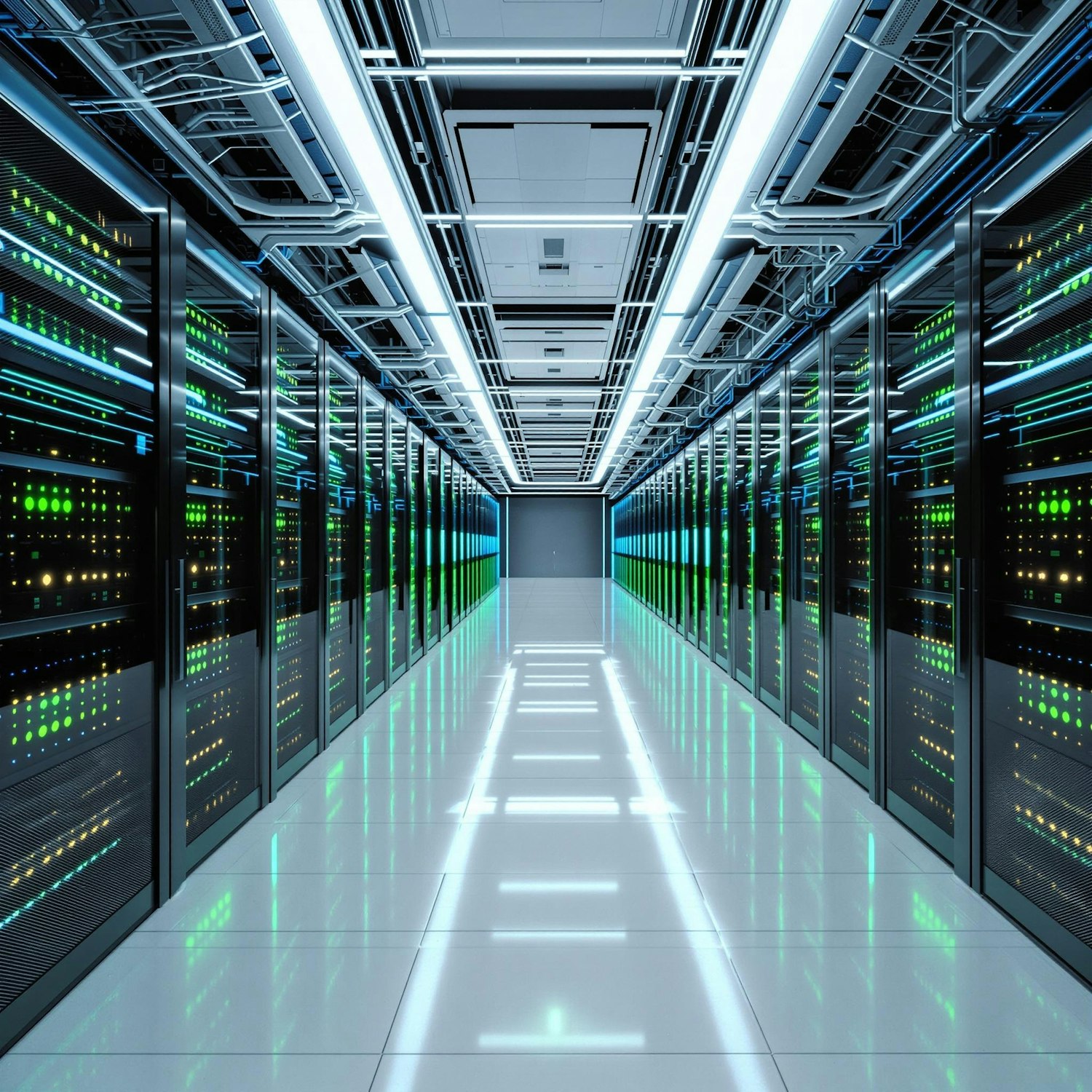 A sleek data center with glowing server racks, reflective white floors, and advanced cable management systems in a futuristic setting.