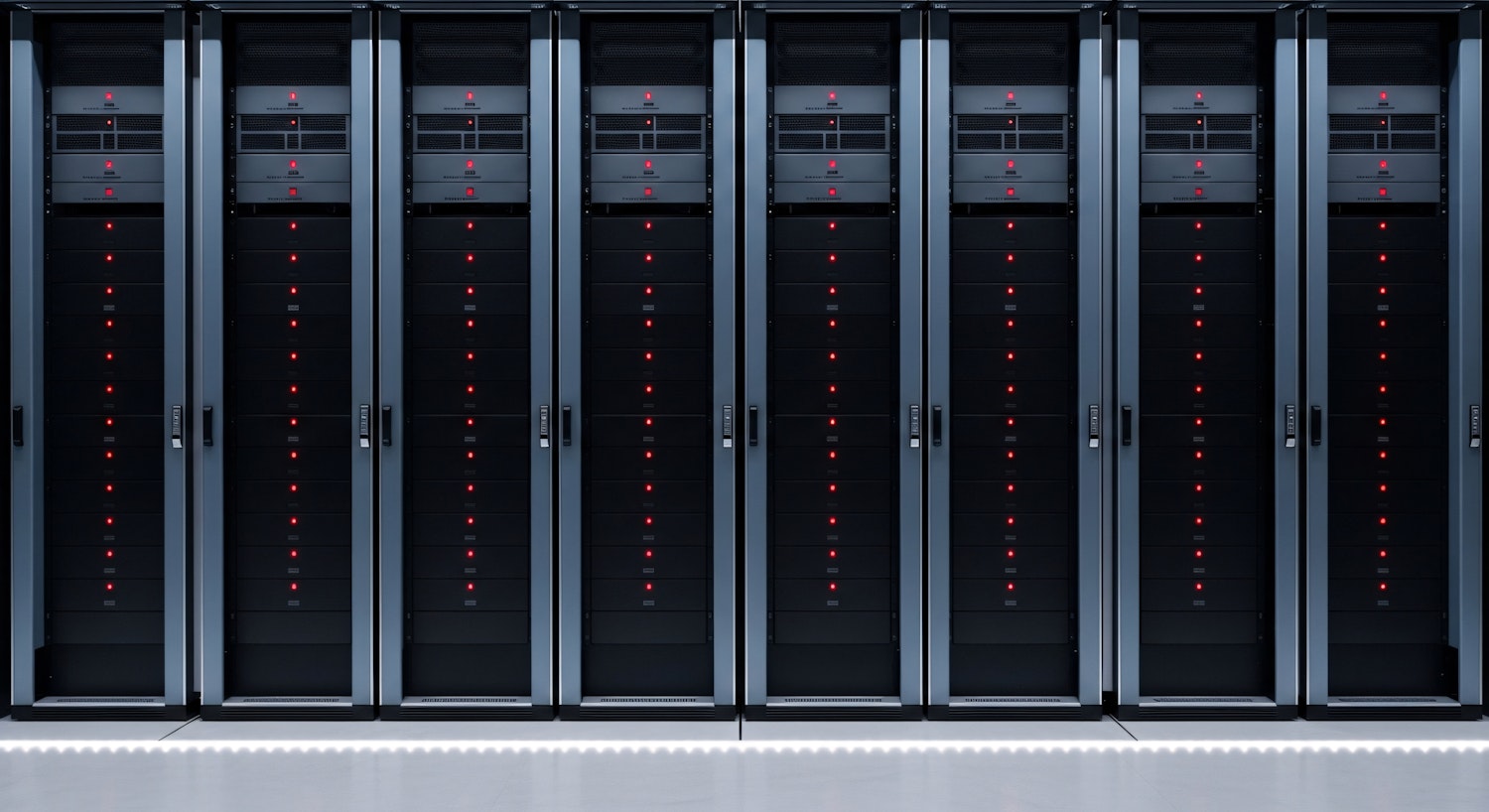 Modern server racks with red indicator lights in a clean, well-lit data center environment.