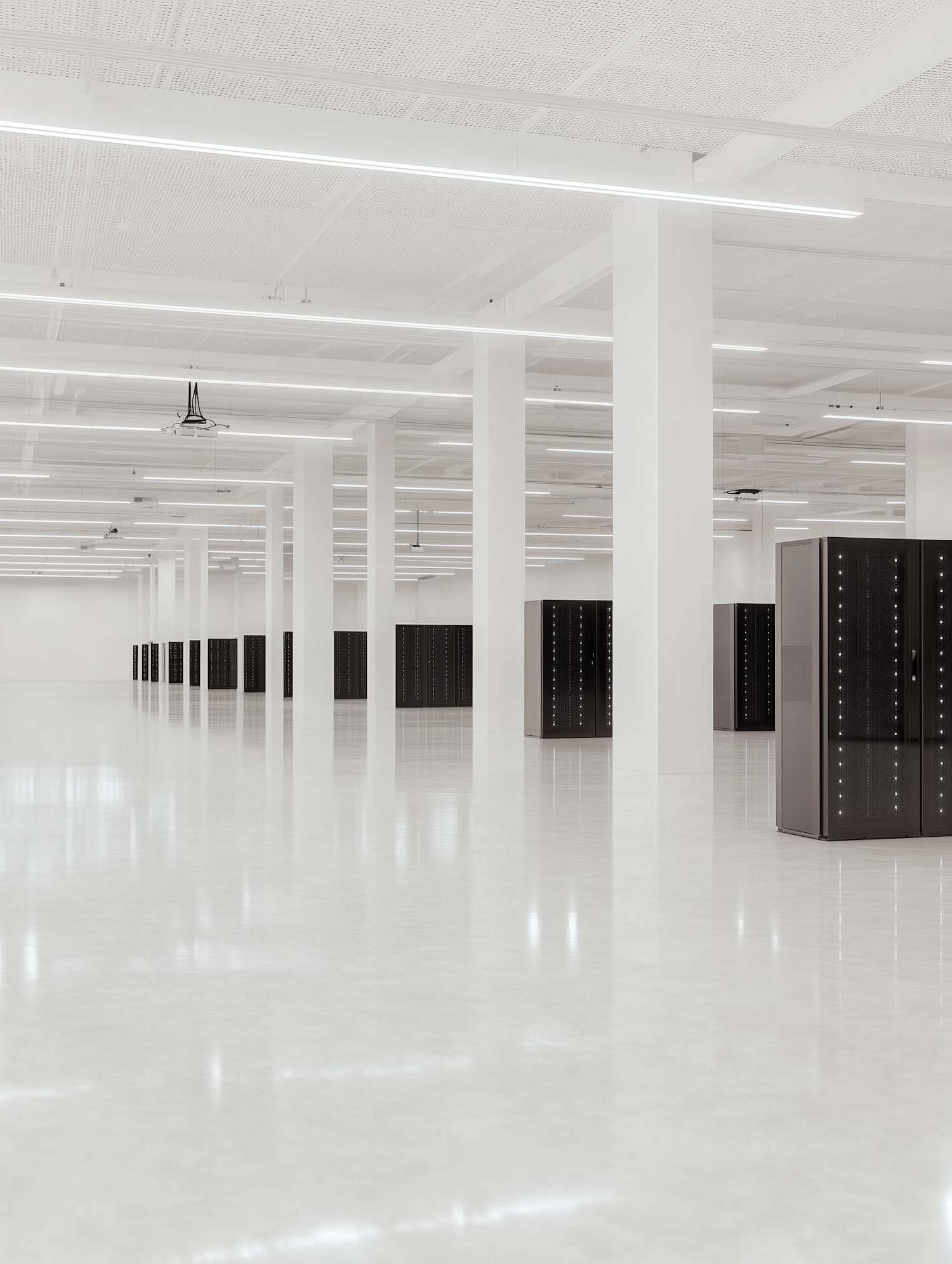 Bright, minimalist data center with rows of black server racks, polished floors, and white fluorescent lighting.