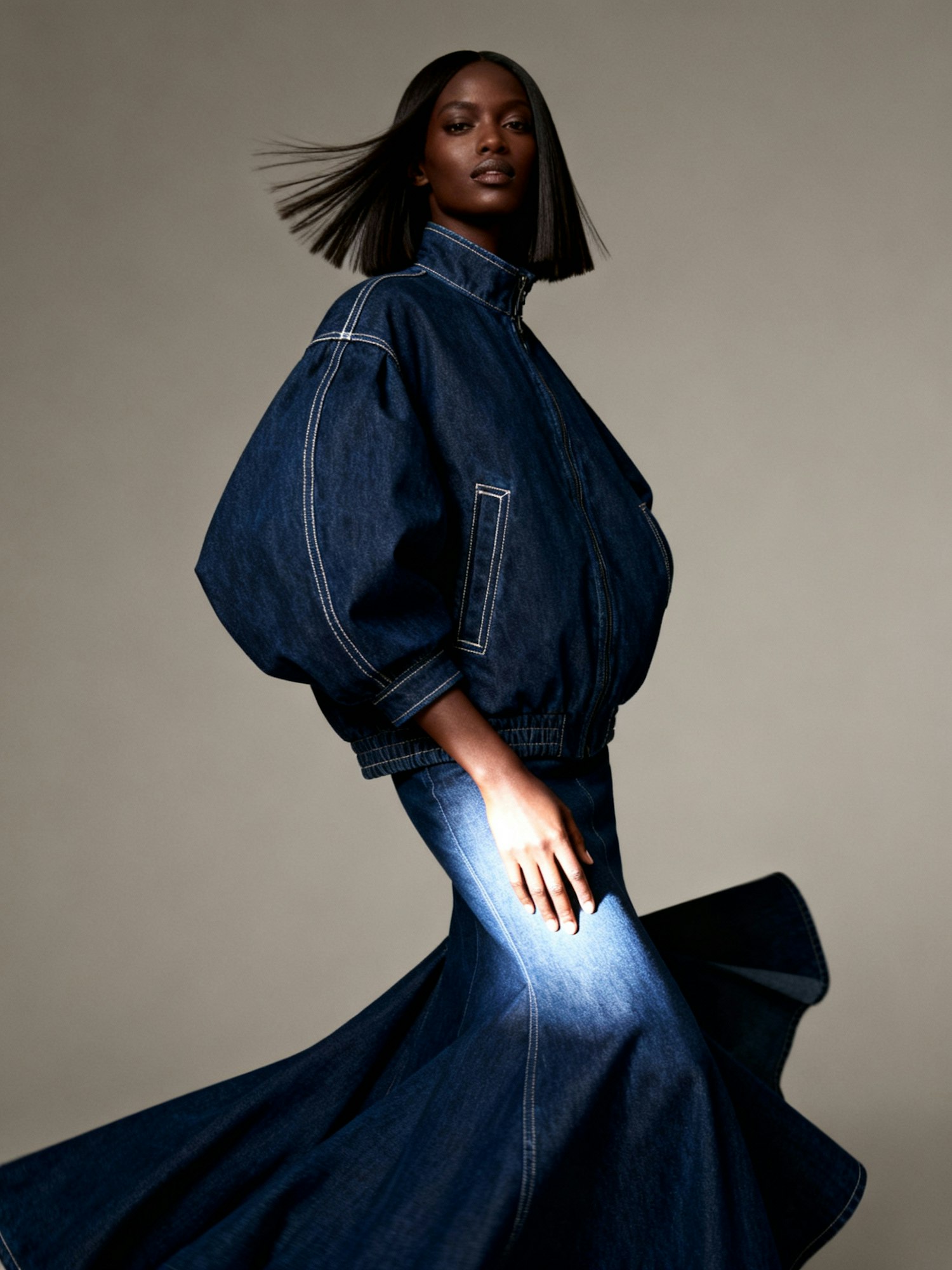 High-definition, cinematic full-body portrait of a confident Black woman standing against a smooth, muted neutral background. She wears a bold all-denim ensemble: a structured, oversized dark-blue denim jacket with exaggerated sleeves and prominent seam detailing, paired with a matching floor-length denim skirt that flows dramatically. Her straight, shoulder-length hair moves subtly with a gentle breeze, adding motion and editorial energy. She poses with relaxed hands, radiating calm confidence. Soft, directional lighting highlights the textures of the denim, the flowing silhouette of the dress, and her flawless, glowing skin. Slightly shallow depth of field keeps the focus on her strong, high-fashion presence. Mood: modern, striking, and cinematic—merging streetwear attitude with couture sophistication.