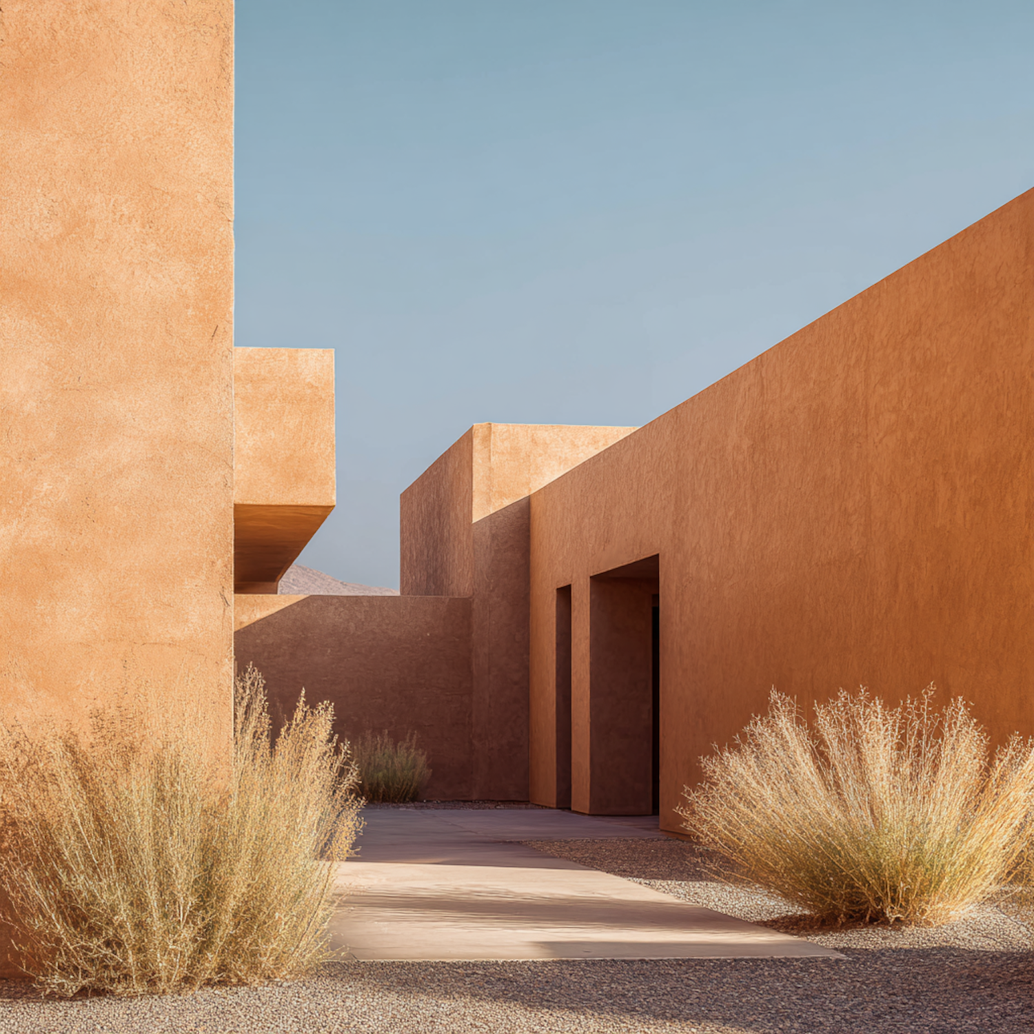 Modern desert architecture with earthy tones, clean lines, and minimal landscaping under a clear blue sky.
