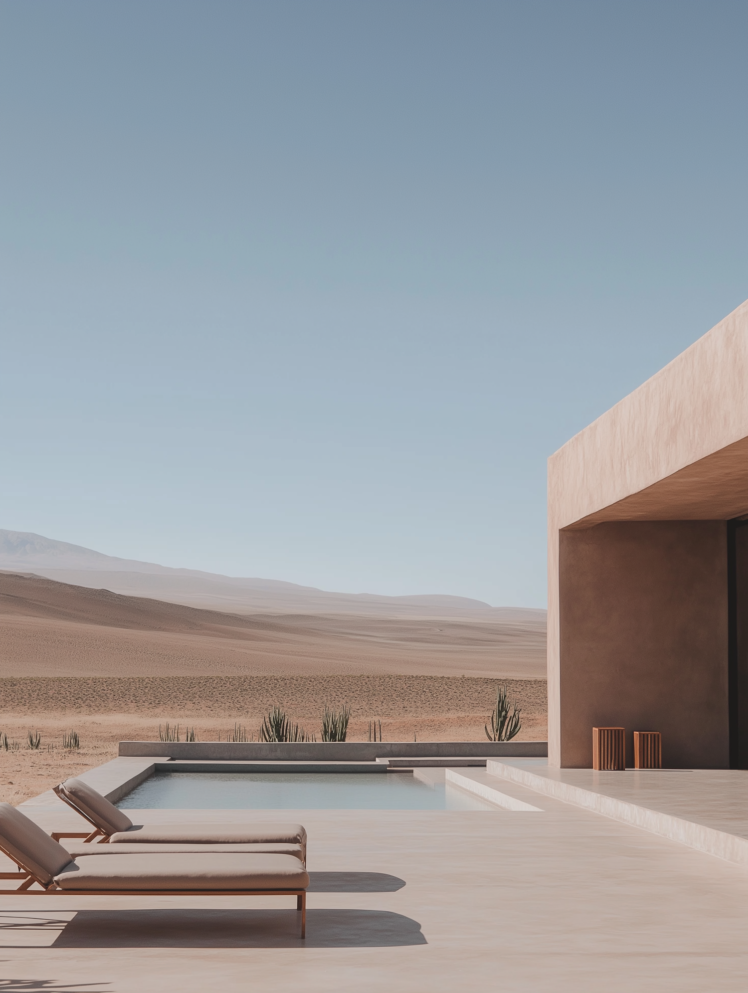 Minimalist desert poolside with lounge chairs, modern architecture, and serene dunes under a clear blue sky.